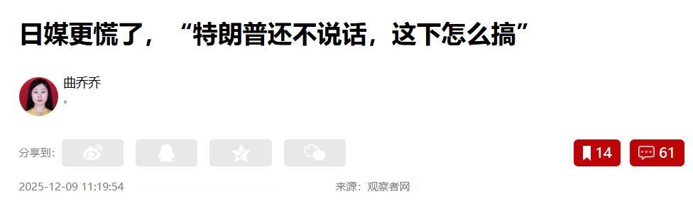 12月9日,日媒《日经亚洲》刊文称“日本的外交韧性正受到考验”,文章担忧的表示,“中国近来对日政策越来越激进,但是美国却一直保持沉默。显然,特朗普政府希望避免因此和中国产生摩擦。尤其是2026年中期选举临近,特朗普需要和中国保持良好的贸易关系。”