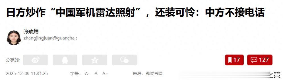 根据《观察者网》引述的《日经亚洲》的消息,日本方面9号称中国战机上周六(6日)在公海用雷达照射日本战机后,日本防卫省官员试图通过热线联系中方,但未得到任何回应。日媒强调,该消息来自日本议会上一位日本官员的通报。