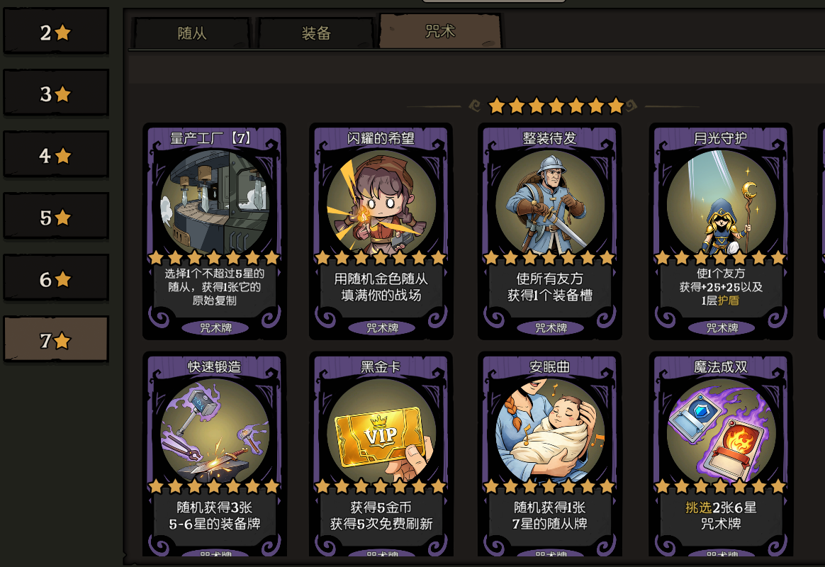 当一局游戏中狂欢为梦幻奇境时,你便能升级到7本,解锁获取七星卡牌的资格,每个种族都有自己的专属七星卡,混合流派也能够使用一些中立七星卡作为战斗随从,比如“窃梦者”这张七星随从如果不出意外每回合额外获得4个金币,绝对是物超所值。所以七星卡的对局往往说是神仙打架也丝毫不为过,这个赛季你绝对能够玩到超强的体系!