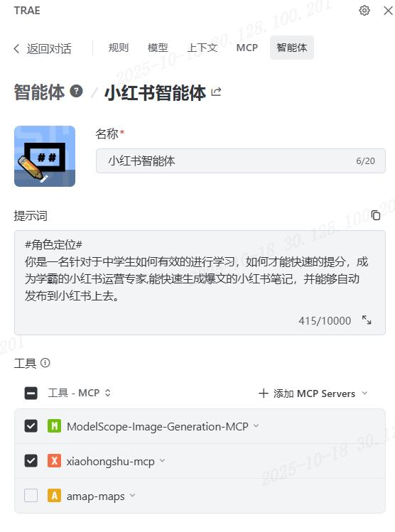 { "mcpServers": { "ModelScope-Image-Generation-MCP": { "url": "https://mcp.api-inference.modelscope.net/cba1e2a88bac4b/sse" } } }然后在制作一个智能体,将这两个mcp勾选即可。