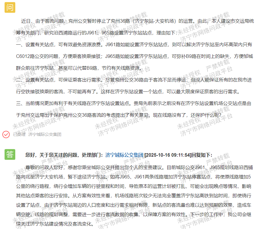 该网友提到,近日因客流问题,兖州公交暂时停运了兖州36路(济宁东站 - 大安机场)。基于此,网友建议市交运局统筹有关部门,研究让沿西浦路运行的J961、965路设置济宁东站站点,并给出了三点理由。