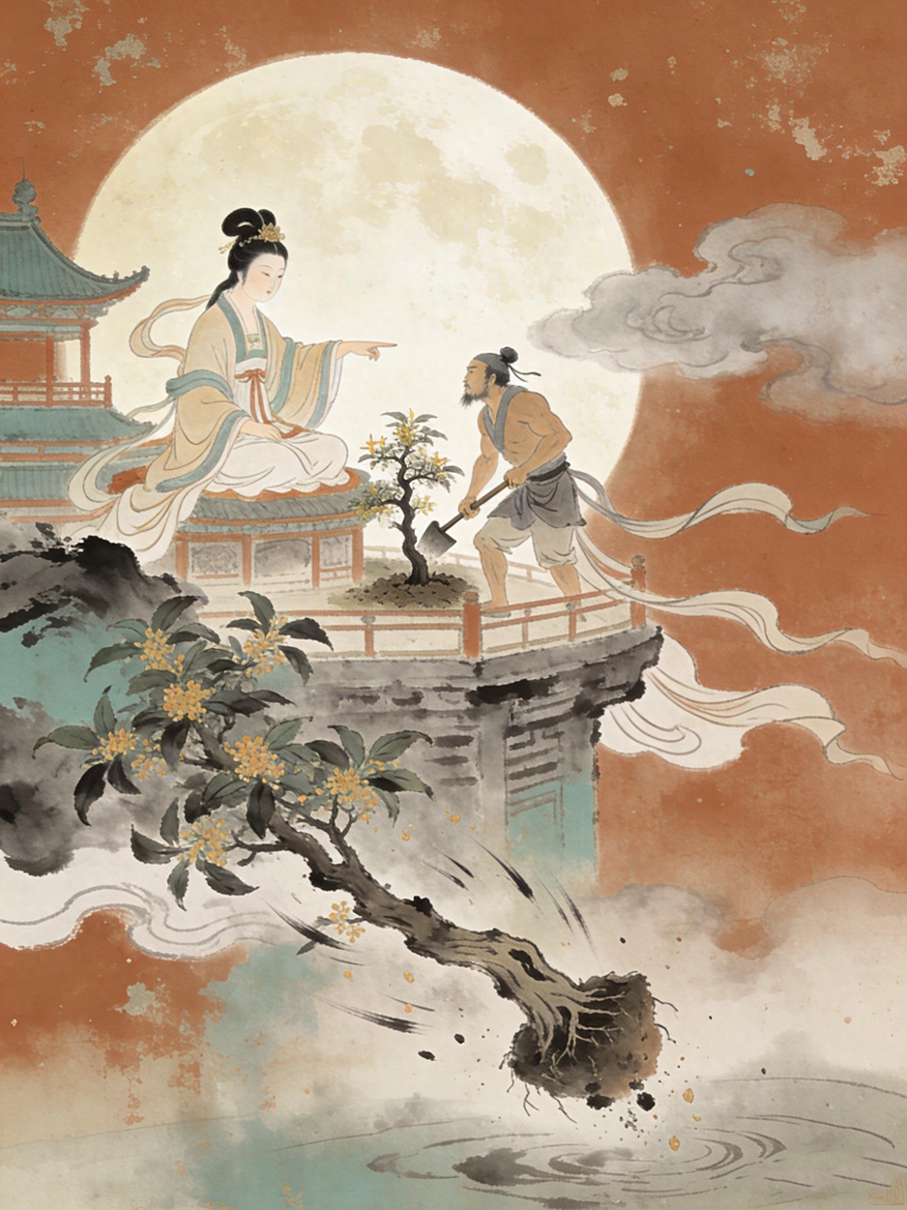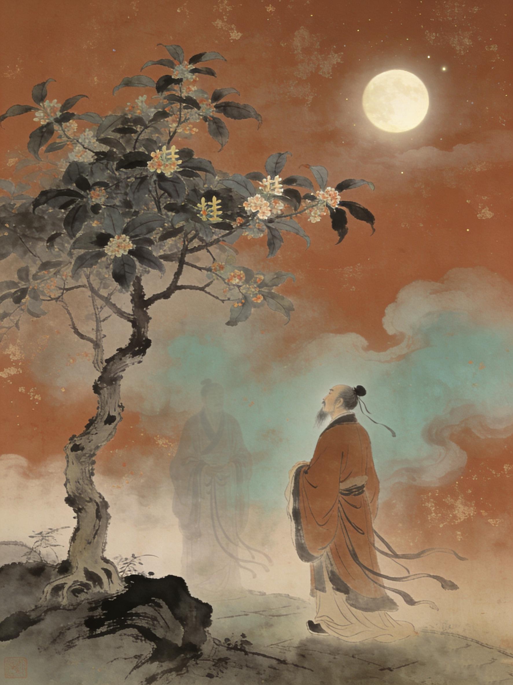 一天夜里,有位道士陪着一位老翁趁着月色走来,在树下吟诗长啸。道士指着桂树笑着说:“这是月宫的第七棵桂树啊。” 老翁说:“月宫里的仙花,香气应该比灵鹫山的花还要浓上百倍,怎么会这么没精打采的?”