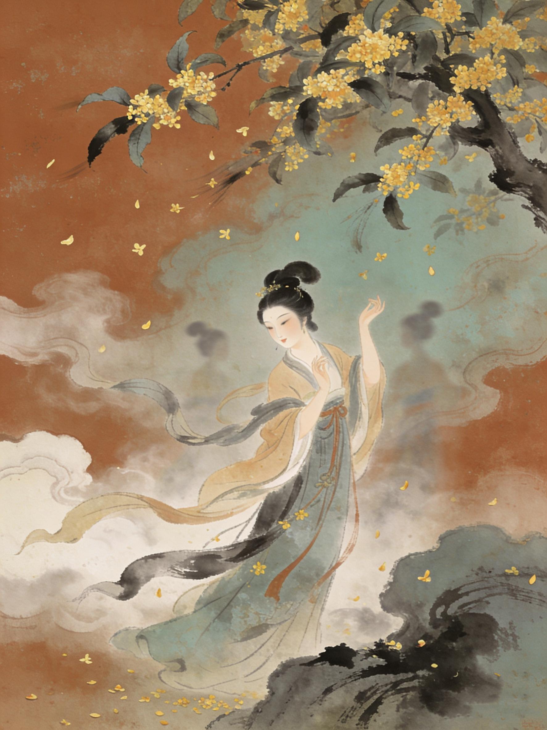 唱完,西风再次刮起,烟飞云卷,美人们忽然消失不见了。那些飘落的桂花,又被风吹回树上,重新缀满枝头。