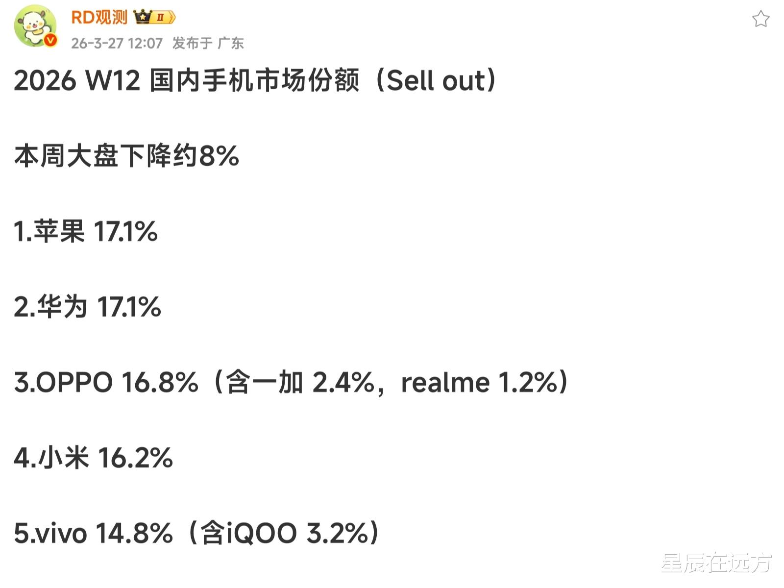 这周手机圈的销量数据一出来,排名也彻底变了天:苹果以微弱优势拿下第一,华为紧随其后稳坐第二,OPPO 冲到了第三,小米排在第四,vivo落到了第五的位置。