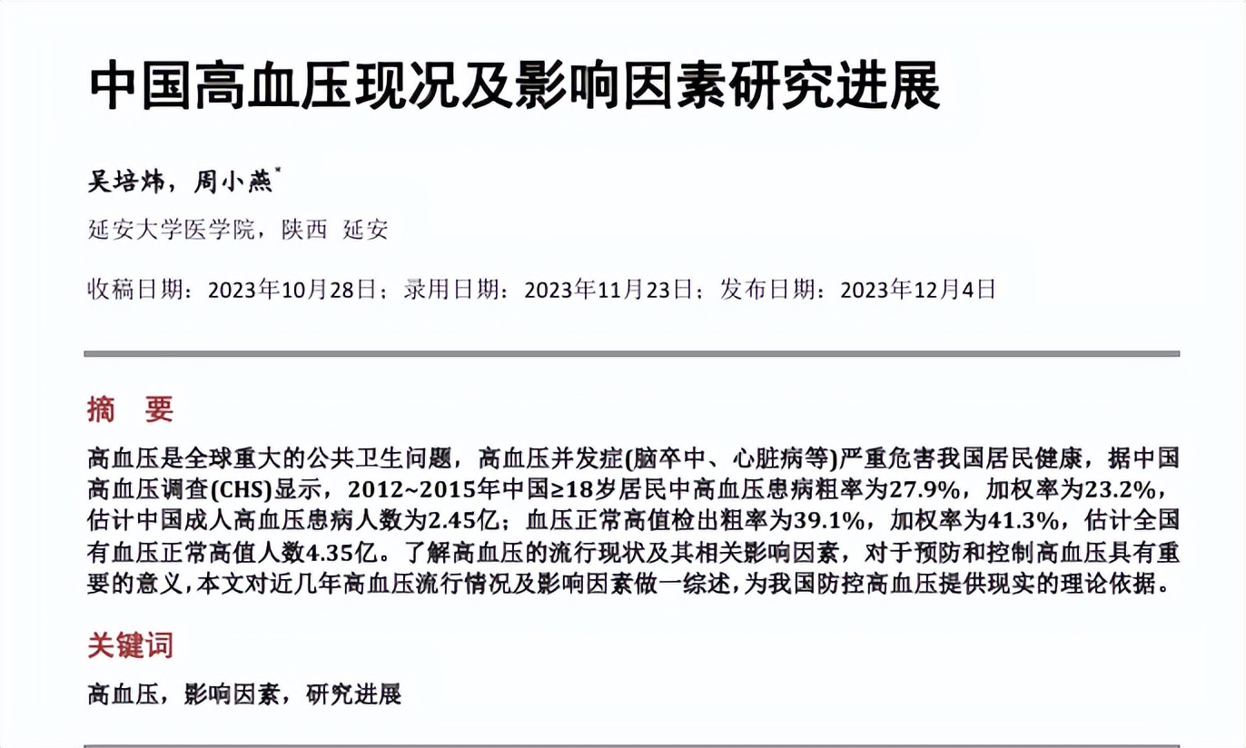 参考资料:[1]吴培炜, 周小燕. 中国高血压现况及影响因素研究进展[J]. 临床医学进展, 2023, 13(12): 18604-18609.