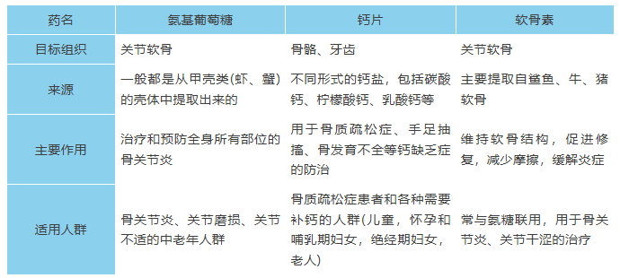 氨糖是人体内关节软骨的重要成分,软骨素主要负责关节的保水润滑和抗磨损,钙片主要用来辅助补充人体所需的钙质,三者各司其职,缺一不可,具体区别请看下列表格。