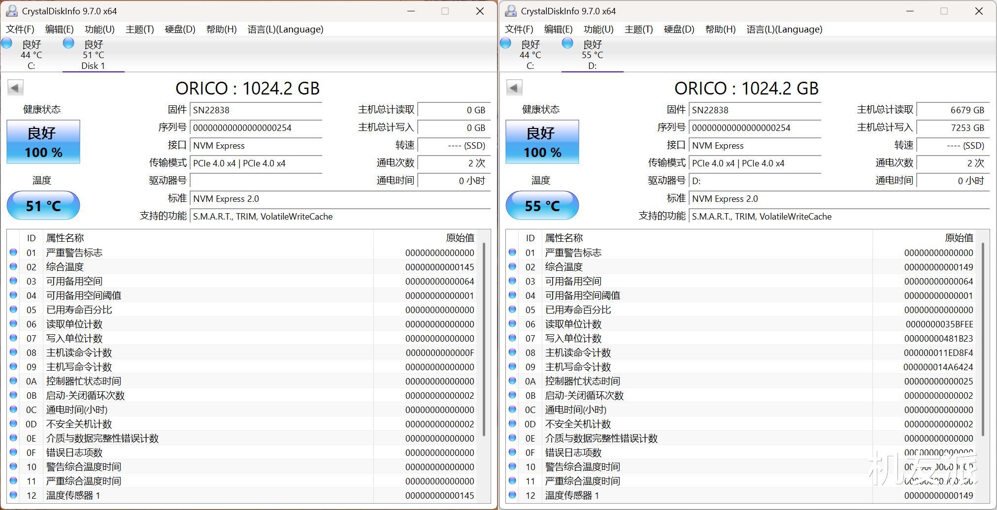 容量方面,通过CrystalDiskInfo可以看到,这款奥睿科TurboS4 1TB SSD的存容量为1024GB,足够安装常见的办公软件、设计软件、大型游戏等。另外,在待机温度方面,能够维持在55℃,还是非常不错的。