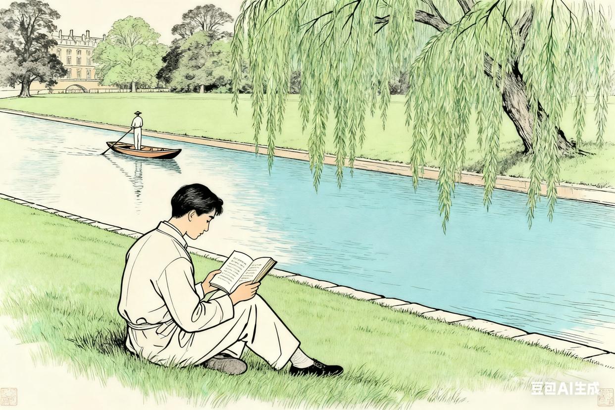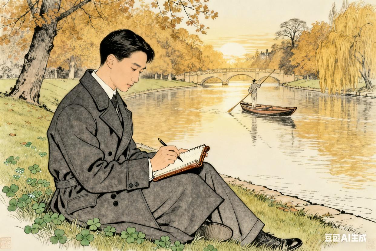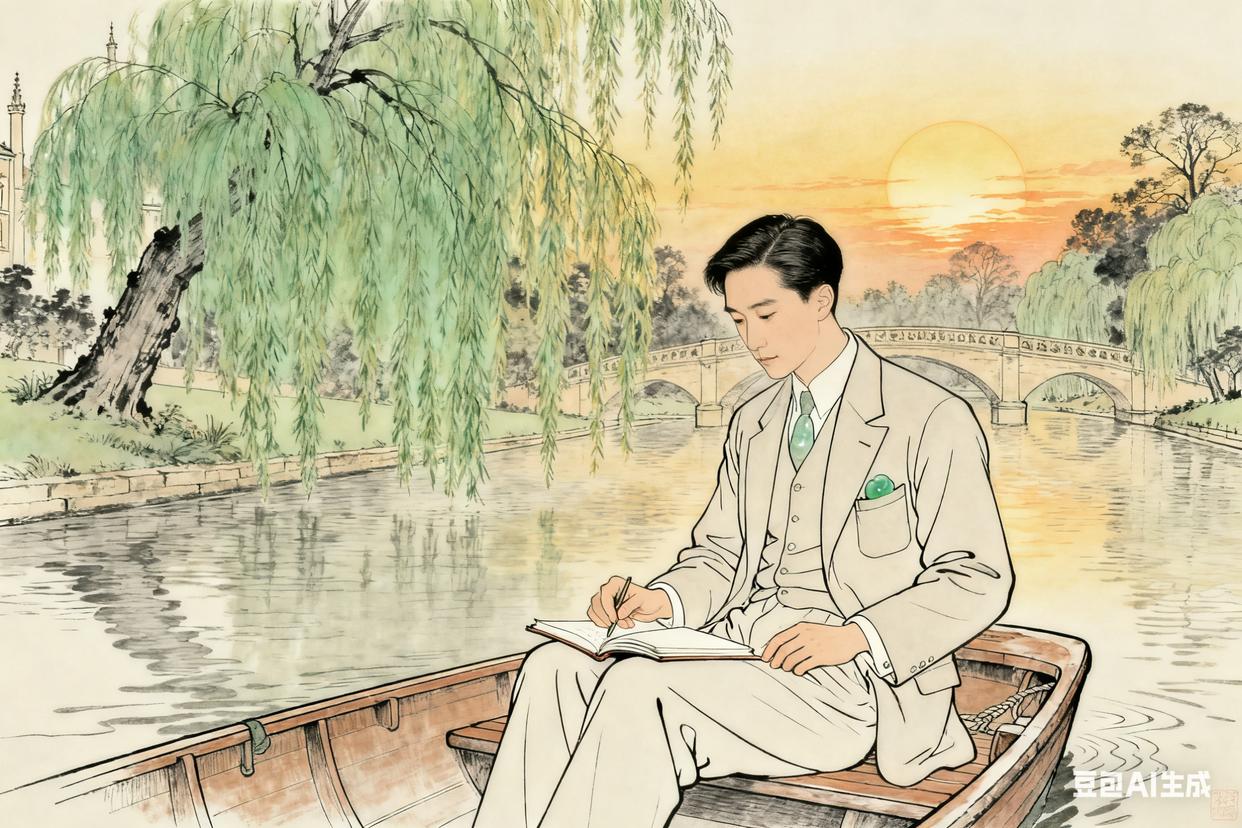 1920年9月,徐志摩从美国乘船去了英国。他本来是要去伦敦政治经济学院师从罗素,可到了伦敦才知道,罗素已经离开学院。失望之际,他经朋友狄更生介绍,去了剑桥大学国王学院旁听。第一次坐在剑桥的课堂里,听教授讲英国诗歌,他突然觉得"心里的某扇门被推开了"。课后,他常去康河边散步,有时会租一条小船,顺着河水漂着,看岸边的垂柳在水里的倒影,听学生们唱着民谣。有一次,他划着船经过一座桥,看到一个姑娘坐在桥边看书,阳光洒在她的头发上,像镀了一层金。他愣了半天,直到船撞到岸边的石头才回过神,后来他在日记里写"那一瞬间,我好像懂了什么是诗"。