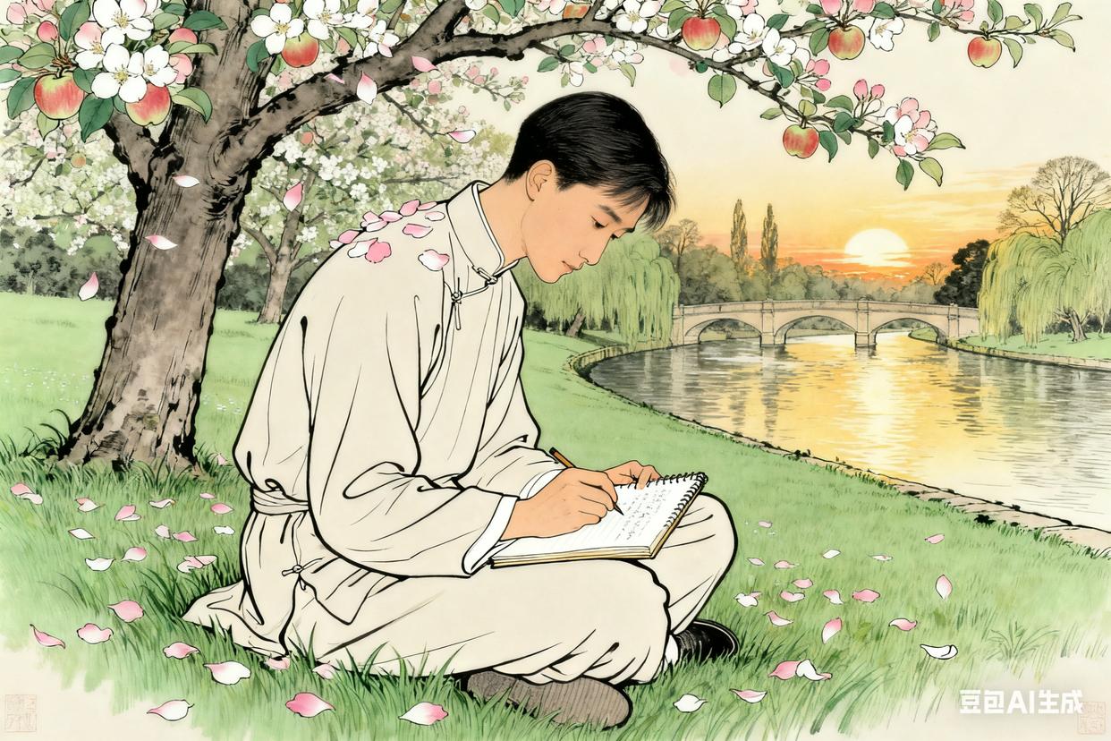 1921年春天,徐志摩在康河边的一棵苹果树下,写下了第一首成型的新诗《康桥西野暮色》。那天下午,他本来是去图书馆查资料,路过苹果树时,看到花瓣落在草地上,像一层粉色的雪。他赶紧掏出笔记本,笔尖在纸上飞快地动着,"晚霞是西天的胭脂,映着草坪的青",写了又涂,涂了又写,直到天色暗下来,才满意地合上本子。他把诗拿给剑桥的朋友看,朋友说"这诗里有光",他听了,心里比吃了蜜还甜。从那以后,他几乎每天都写诗,有时在课堂间隙,有时在深夜的宿舍里,台灯下,他的影子映在墙上,随着笔尖的移动轻轻晃动。他还开始给国内的《晨报副刊》投稿,当第一次收到样刊时,他拿着报纸,在剑桥的校园里跑了一圈,像个孩子一样兴奋。