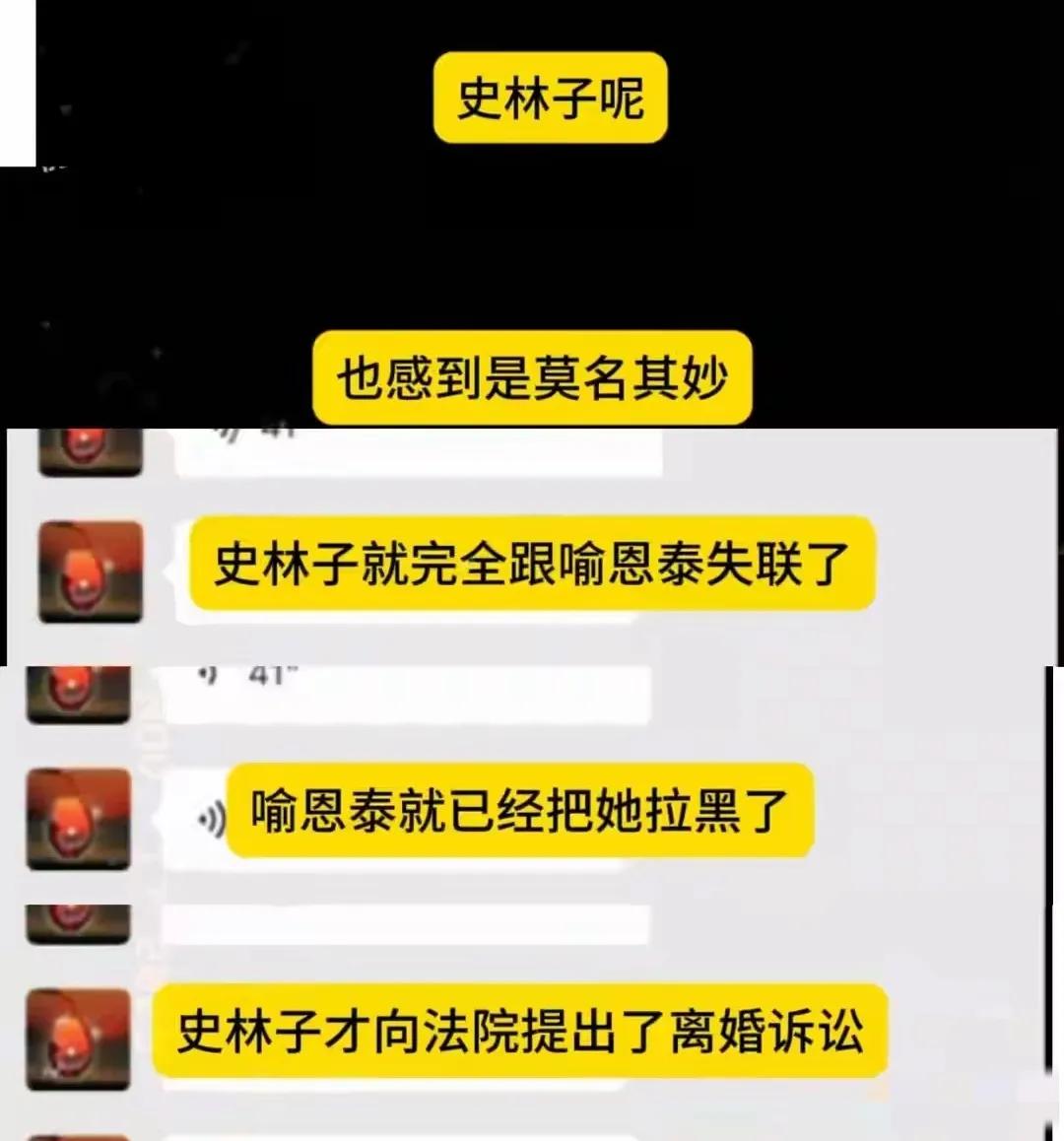 最让人无法理解的是,前几个月喻恩泰直接拉黑了史林子,彻底失联,这才让她下定决心起诉离婚。