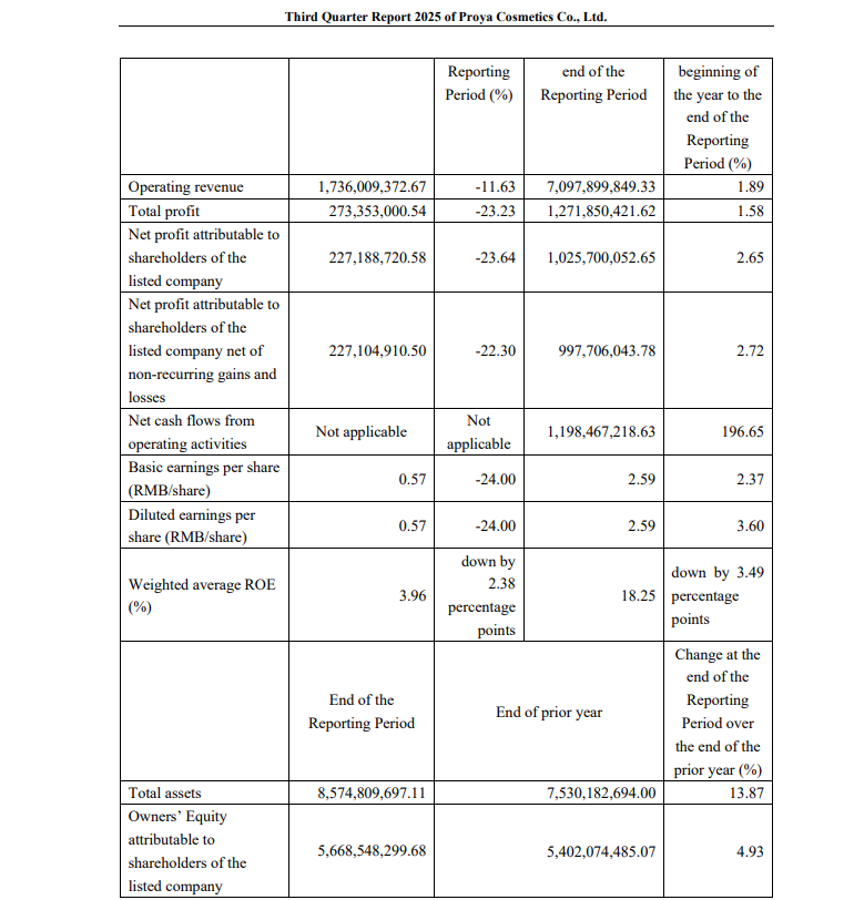 2025年10月31日消息,珀莱雅发布2025年第三季度报告,报告显示,公司前三季度总营业收达到70.98亿元,同比下降11.63%。净利润为2.27亿元,同比下降23.64%。创近年来单季度最大跌幅纪录,下滑幅度远超市场预期。