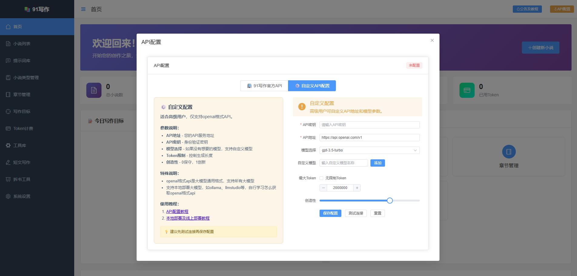 2、API 密钥配置信息填写完,测试连接通过后,开始创建小说