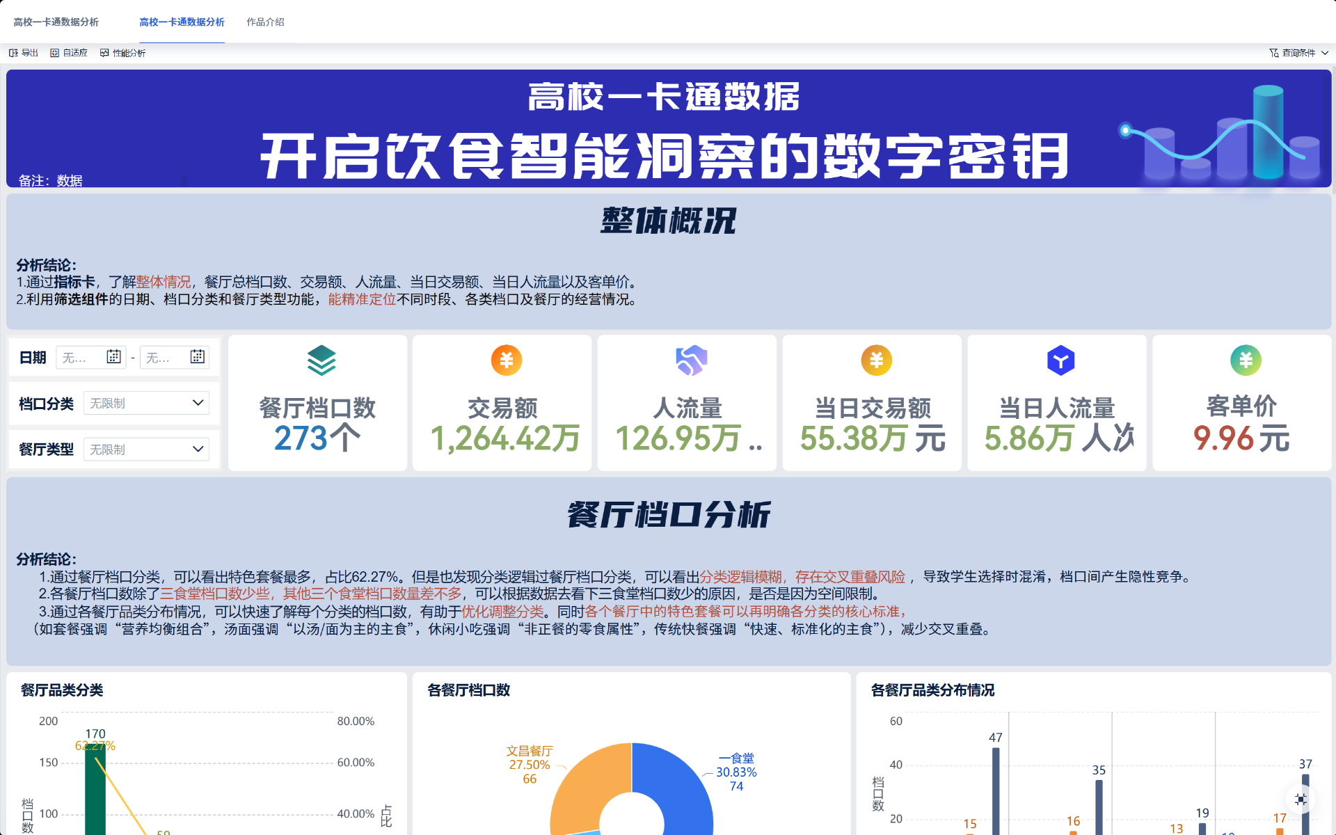 在餐厅档口分析部分,数据清晰显示特色套餐类档口多达170个,占比超过62%,但分类定义模糊。