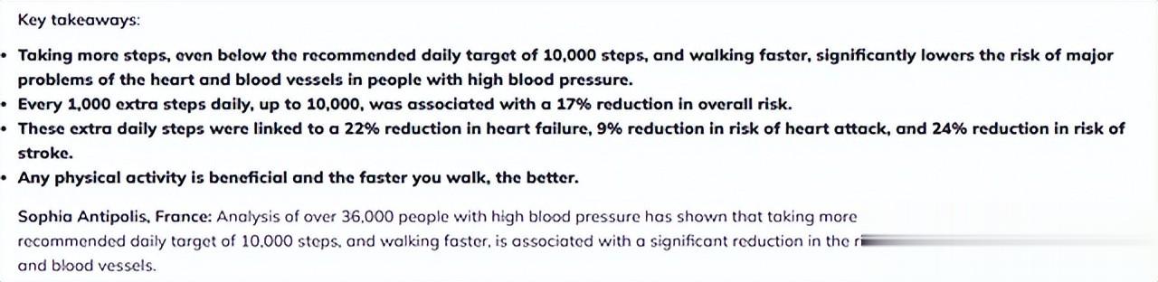 还有一项研究,刊在欧洲心血管预防医学杂志上,他们分析了3万多名高血压患者,结果发现,每天走的步数比只有2300步的人多的人,每增加1000步,每天步数越多,患主要心血管不良事件(MACE)的风险就下降得越多,最多可见到整体风险大幅降低。