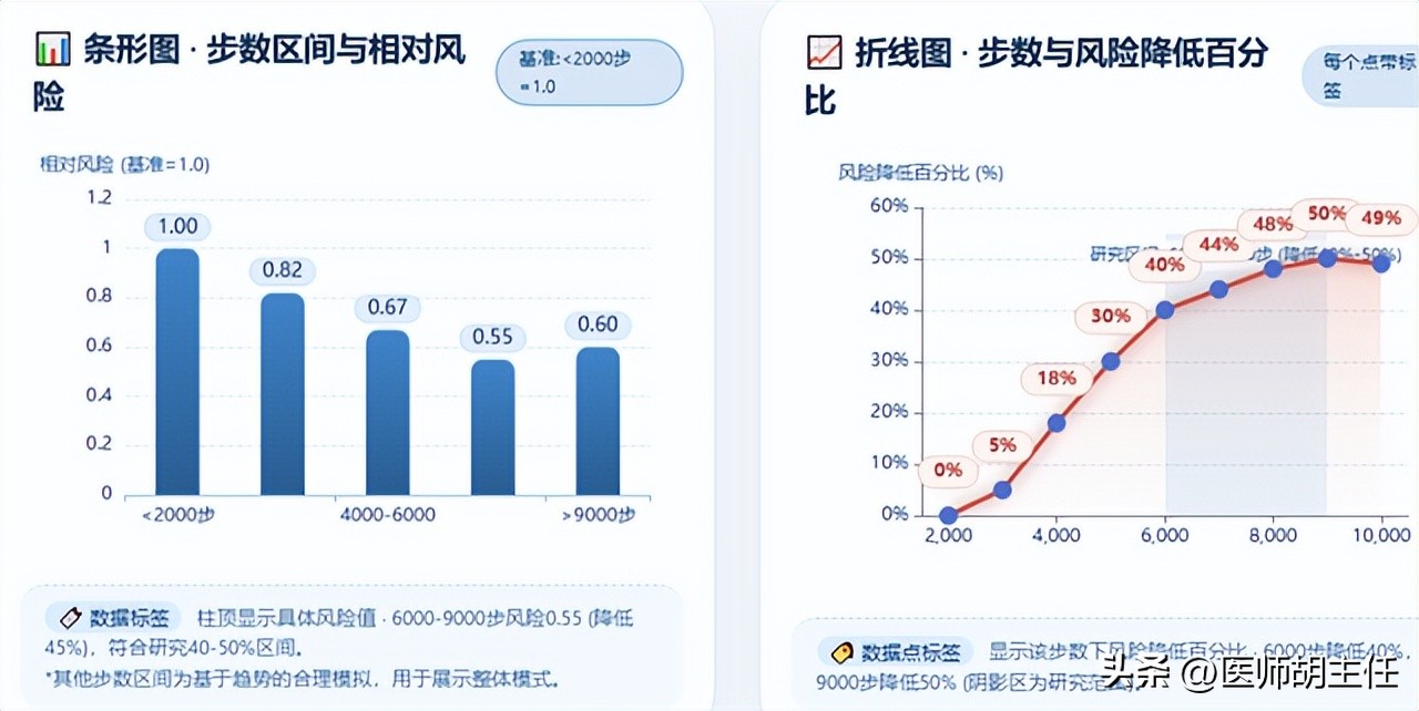 比如,美国马萨诸塞大学的一个团队在中文期刊《循环》上发表的研究发现,60岁以上的人,如果每天能走6千到9千步的话,在平均随访6年后,其心血管事件(心梗、卒中等)风险比每天只走2000步的人低了大约40%–50%。这说明只是把日常走路量从很少提升到适中,就能让心脏风险明显下降。