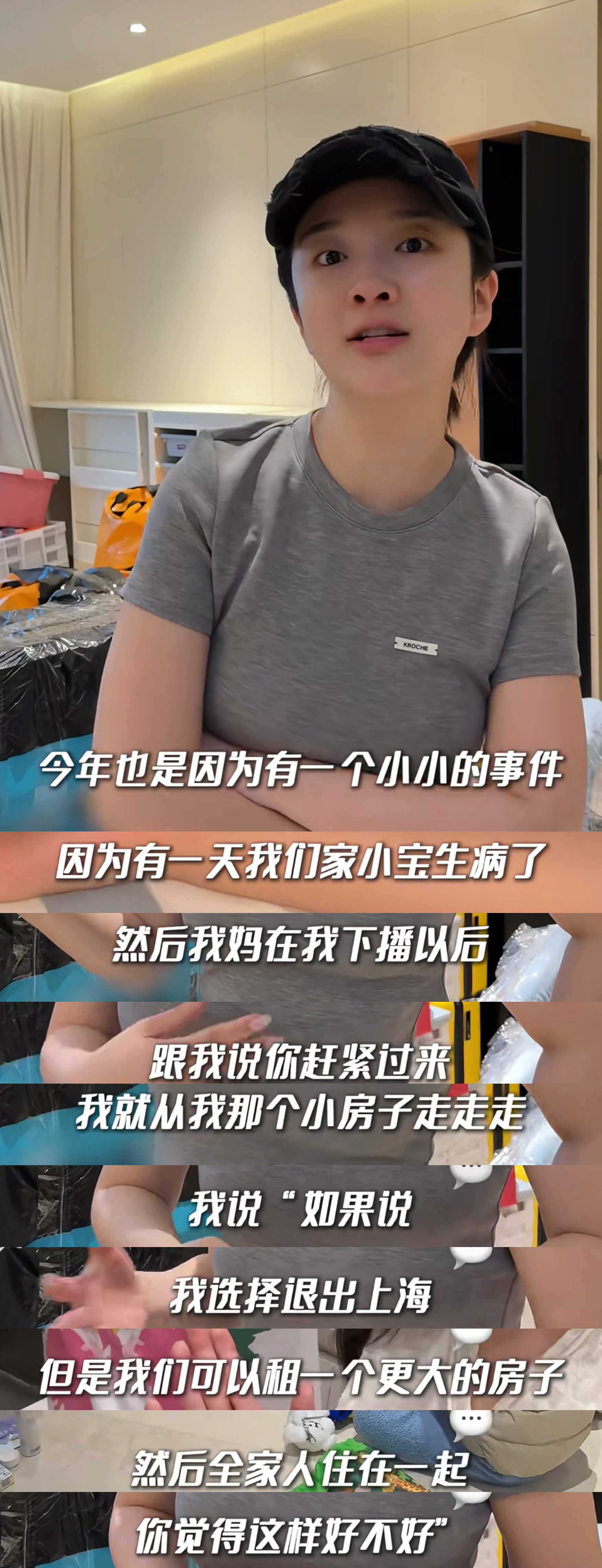 吴雅婷透露前段时间她直播得时候,儿子突然间生病了,她下播后从租的小房子里跑到她们所住得地方,当时就感觉非常得不方便。那天她给妈妈发消息,提到离开上海,租金完全可以在杭州租到一个更大的房子,一家人住在一起,没想到妈妈也很支持。