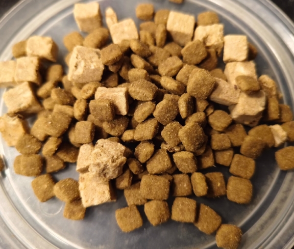 麦富迪狗粮采用膨化工艺,制作成了酥脆的方形小颗粒,带有轻微油腻感。干粮中特别添加了大块牛肉蓝莓冻干,增添了丰富的色彩与风味,看着会食欲提升,酸酸甜甜的口感也能让狗狗更爱吃。