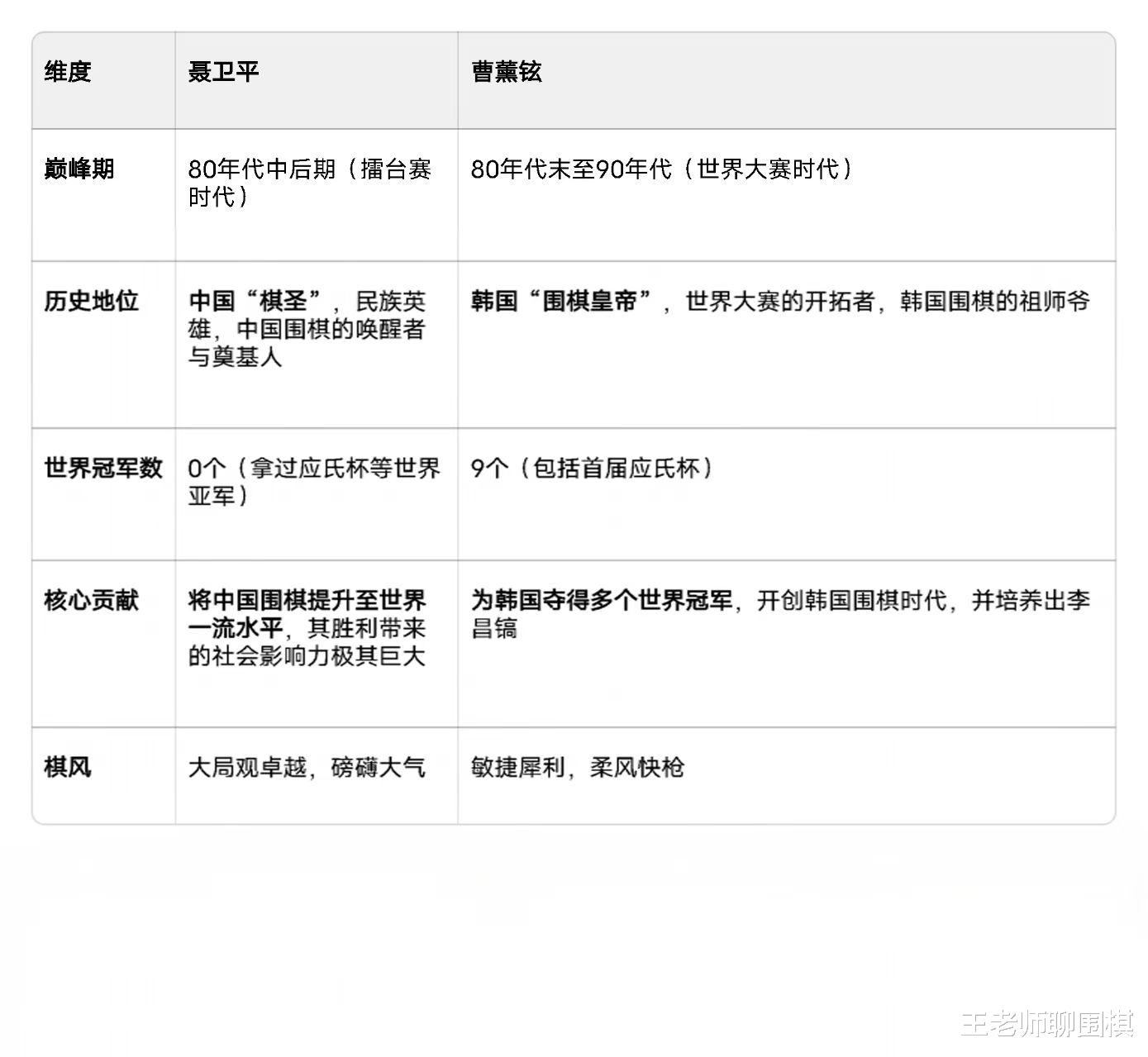 要是单看世界冠军头衔,曹薰铉确实远远超过聂卫平。但要是论对本国围棋发展的贡献,以及在特定历史时期达到的高度和影响力,聂卫平的地位一点也不低,甚至因其“孤胆英雄”的色彩而更具传奇性。