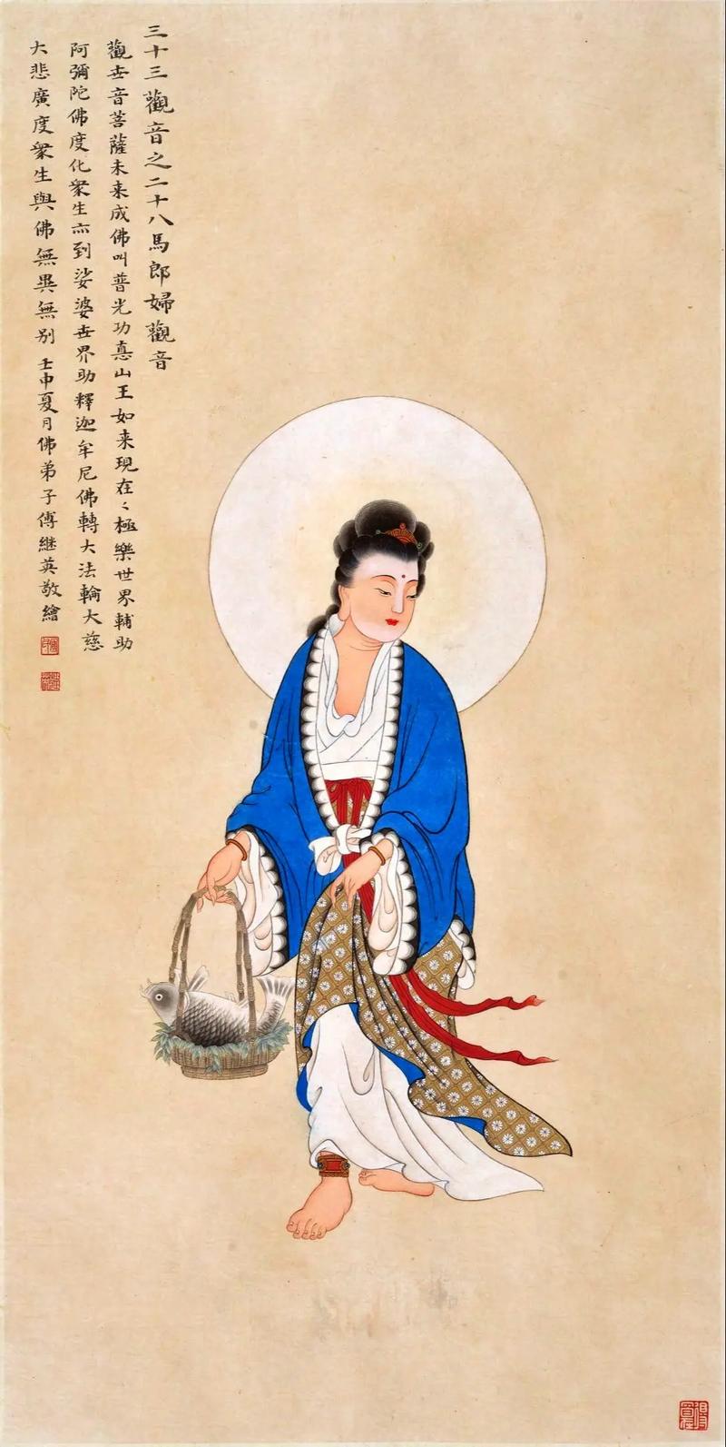 在这种逐日的淘汰中,最后只剩下一个姓马的小伙子。卖鱼女如约嫁到马家,但在成亲当天就死了。下葬后曾有一位老僧用锡杖挑开了她的坟,发现里面只有一副黄金锁子骨。老僧告诉人们,这是观音菩萨化身来教化大家的,说完就飞空而去。后世的画家们创作了很多描绘这个故事的画。