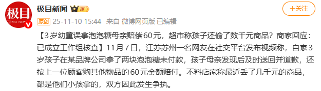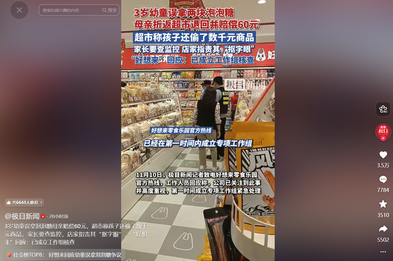 2025年11月11日消息,据极目新闻,近日,有网友发视频称,自己家的3岁孩子在“好想来零食乐园”拿走2块泡泡糖未付款,很快被孩子母亲发现,马上将商品送回并向超市道歉。意想不到的是,超市老板称,近期店内丢失价值几千元的商品均为其孩子所为。