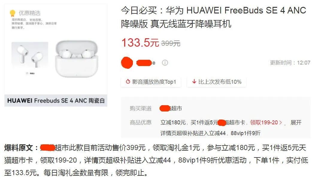 根据张大妈爆料,某猫活动价399元的华为FreeBuds SE4降噪版耳机,通过一堆骚操作后,实付低至133.5元,这还是没算上淘金币的价格,如果有淘金币可以做到12X元左右。目前该爆料点值率90%,有35人认为值,4人认为不值。