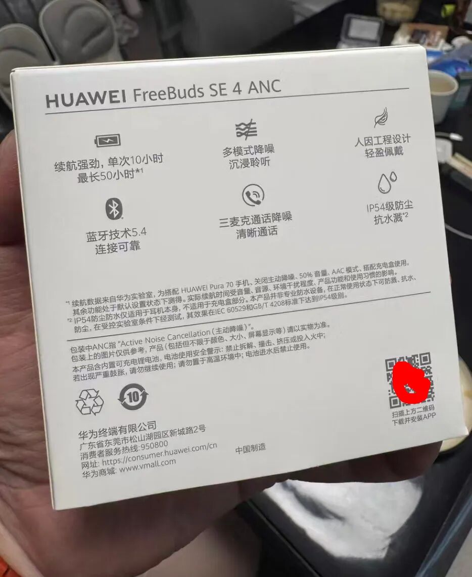 配置上,华为FreeBuds SE4降噪版我归纳就三个卖点。一是支持ANC主动式降噪,全频段平均降噪深度可达24dB。二是单耳机续航可达10小时,配合充电仓总续航可达50小时,这算挺牛的。三是打接电话效果好,因为内置三麦克风,还支持定向拾音降噪功能。