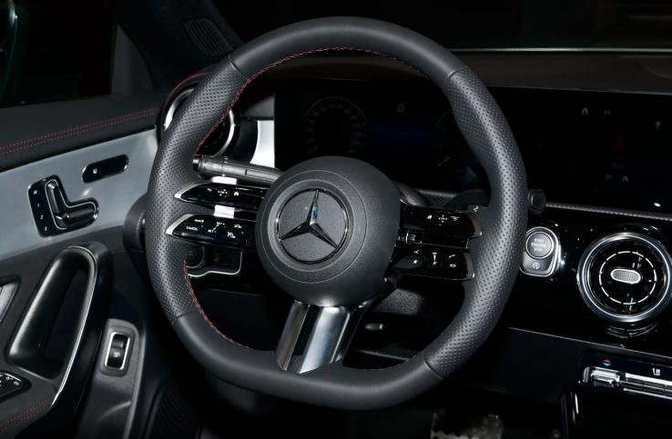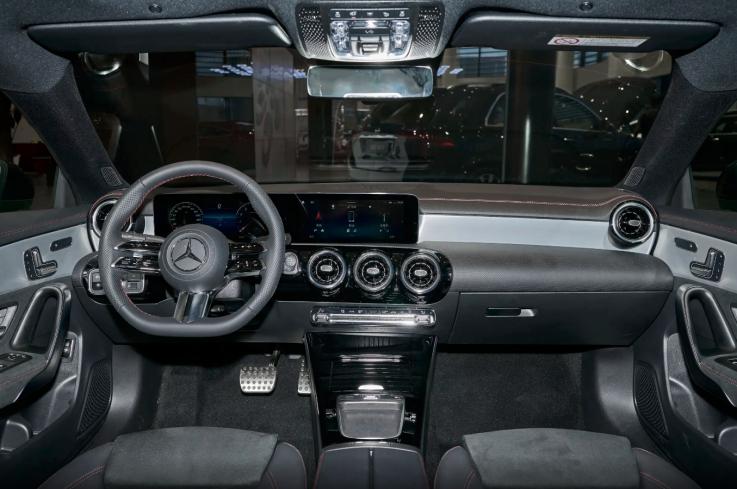 再看座舱内的设计,和国产在售的A级基本保持相似的风格设计,用料方面也高度趋同,双联屏吸引了前排乘客绝大多数视线注意力,中置三环空调出风口采用镀铬元素点缀,搭配上下错位布局的T字型环抱中控台来看,整车内饰在保留豪华座舱氛围的基础上,对细节进行了运动氛围的修饰,包括但不限于红色缝线、翻毛皮包裹、大面积钢琴烤漆涂镀,以及金属镀铬的装点。