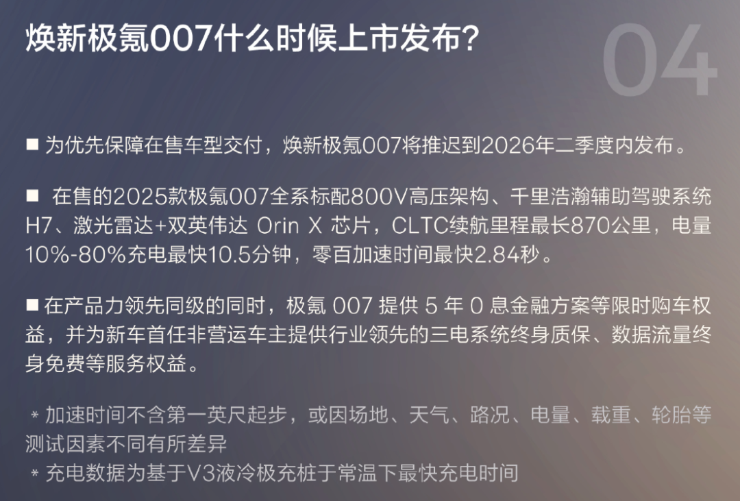 不过有个问题需要注意,由于焕新001和7X订单激增,叠加部分车型共用电池产线,极氪的交付周期出现了延长,甚至推迟了焕新007的发布(从四季度延至 2026年二季度)。如果是急用车的用户,可能需要考虑交付时间,或者看看终端是否有现车。