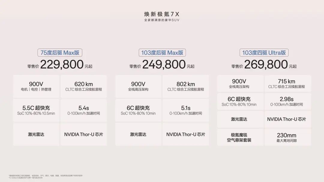 焕新7X没搞复杂的版本划分,只推出了三款车型,核心差异集中在电池容量、驱动形式和空悬,其他配置基本拉平,对消费者来说,不用在基础版缺这、高配版多那里纠结。具体定价和核心参数如下: