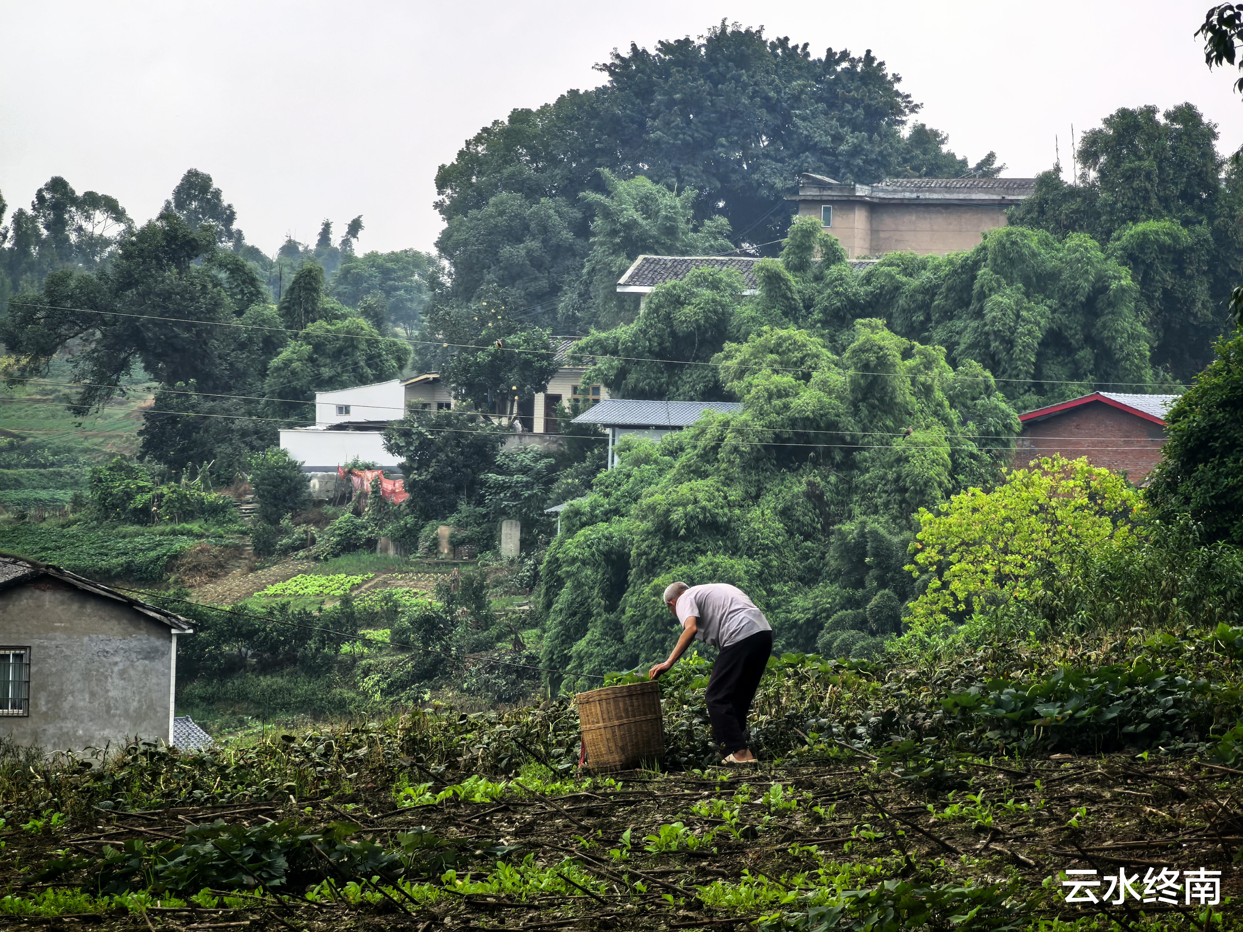 田地里只看到老农俯身劳作,务弄着地里的蔬菜。