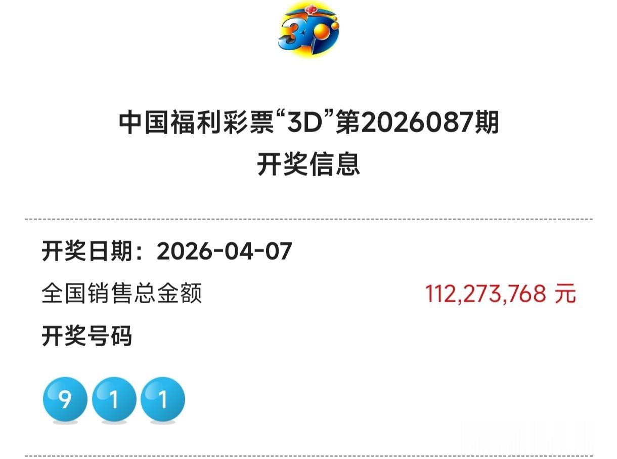开奖快讯福彩3D26087期开奖号码为:9-1-1