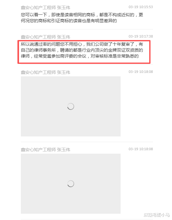 前段时间,我因为商标驳回复审的事情,找了一家叫“北京鑫安心”的知识产权公司。当时,他们的知产工程师张玉伟联系我,发了几份他们所谓的“成功复审案例”,比如《关于第4755号“小厘同学”商标驳回复审决定书》之类的文件,以此证明他们经验丰富、通过率高。