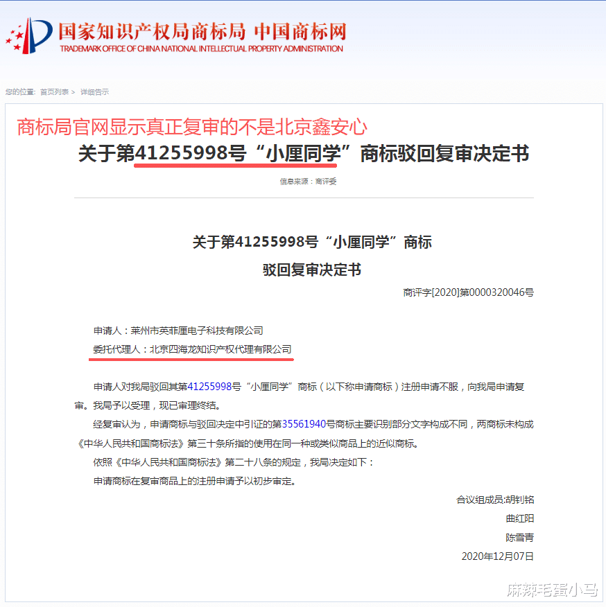出于信任,我决定委托他们办理。但在后续沟通中,我多留了个心眼,自己去商标局官网查证了一下。结果发现,他们发给我的那份“小厘同学”复审决定书,真正的申请人根本就不是他们公司,而是“莱州市英菲重电子科技有限公司”,代理机构也是另一家叫“北京四海龙”的代理所。