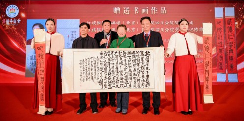 随后,红旗飘飘丰碑颂(北京)书画院四川分院院长王健、党委书记陈维忠向成都梁平商会赠送两幅书画作品。