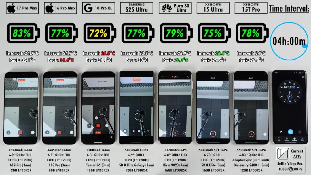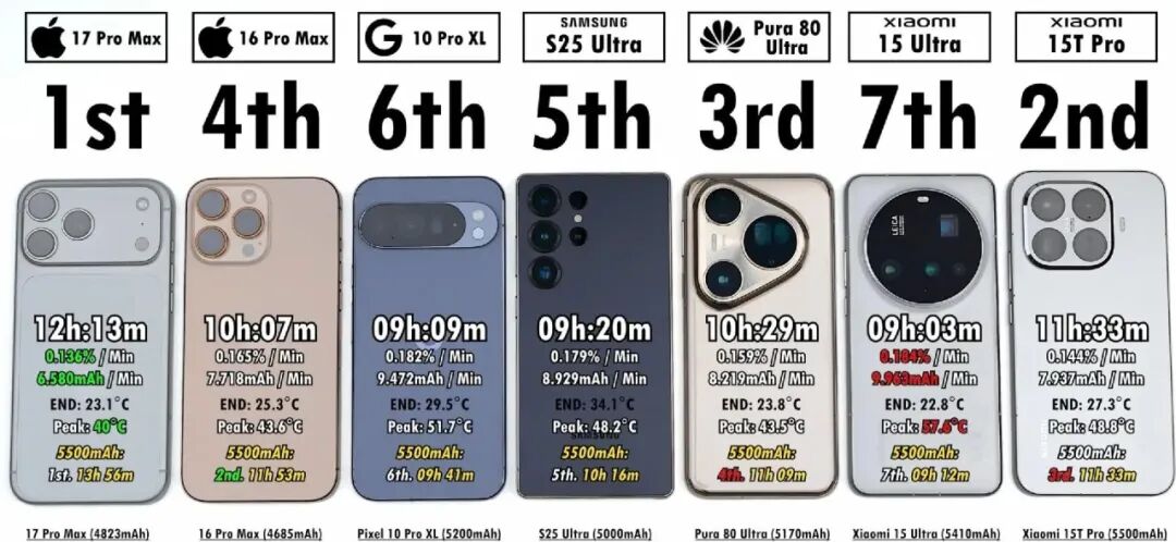 iPhone17ProMax:12小时13分钟小米15TPro:11小时33分钟华为Pura80Ultra:10小时29分钟iPhone16ProMax:10小时7分钟三星S25Ultra:9小时20分钟谷歌Pixel10ProXL:9小时9分钟小米15Ultra:9小时3分钟