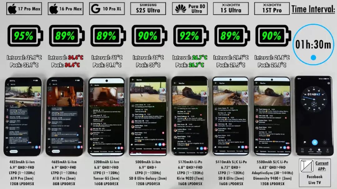 刚开始大家电量都挺稳,iPhone17ProMax以95%电量暂居第一,华为Pura80Ultra和三星S25Ultra、小米15TPro紧随其后,都是90%。有意思的是,iPhone16ProMax居然和谷歌Pixel10ProXL、小米15Ultra打成平手,都是89%。这才刚热身呢!