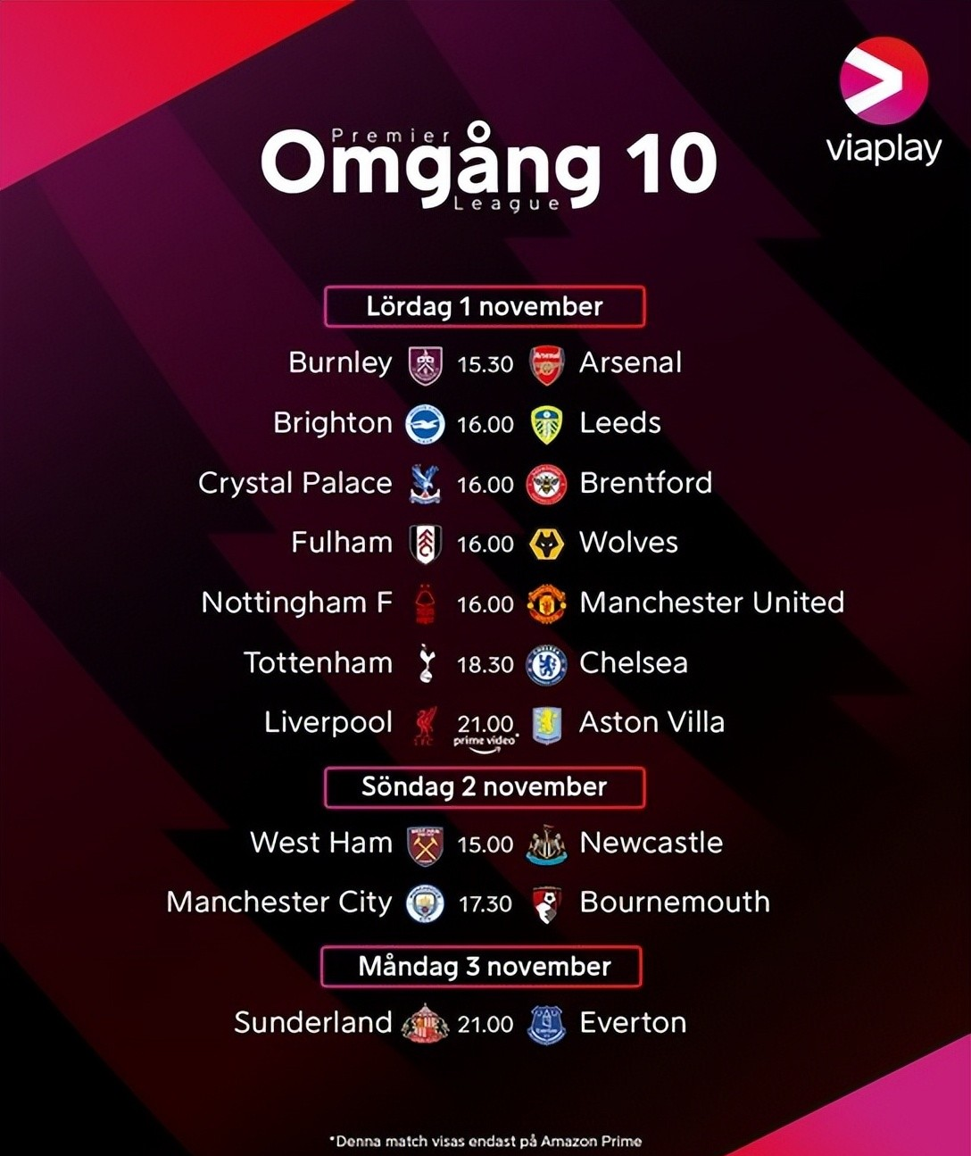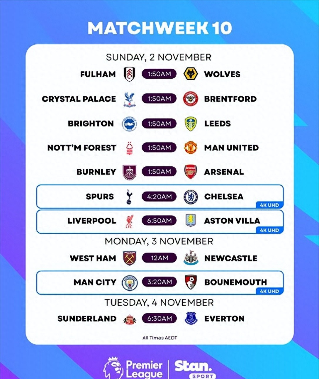 25/26赛季英超联赛第10轮的较量将在11月的第一个周末开打。因为周中英联杯的赛事,所以本轮英超取消了周六凌晨和黄金场的赛制安排,而是将赛事更多的集中于本周六晚间的11点场次和之后更靠后的时间安排。