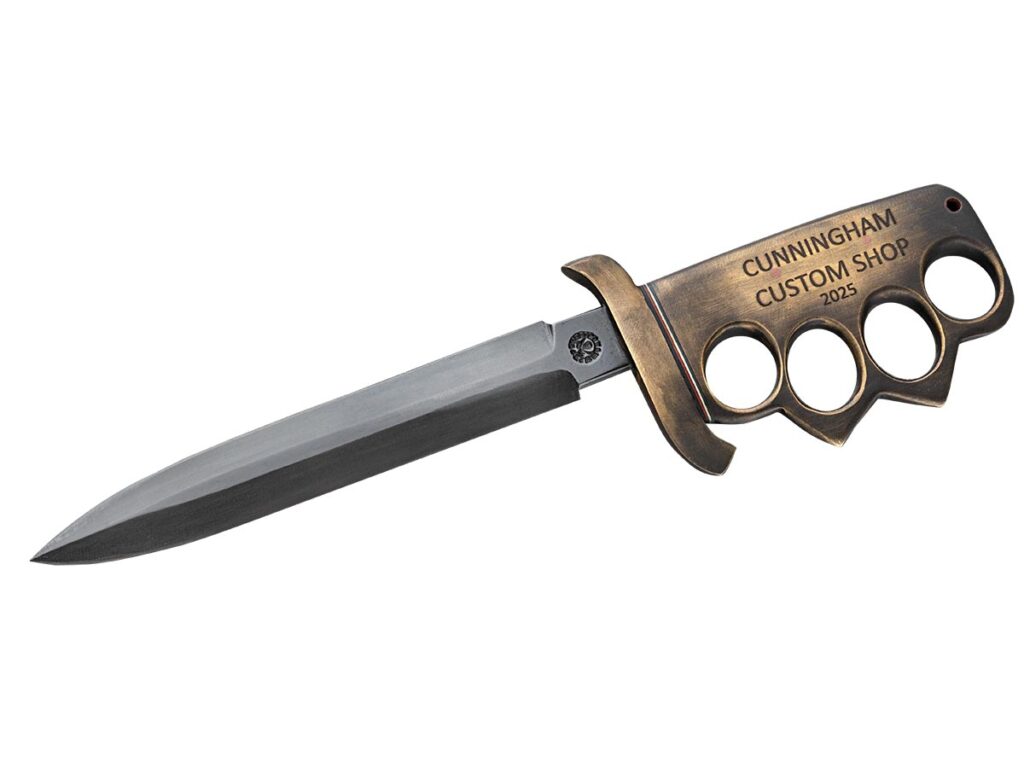 刃长: 8”刃材: 52100 碳钢开刃方式: 双面凹磨手柄: 手工制作的黄铜指环,硫化纤维内衬S-护手: 黄铜总长: 13”鞘: 由 Grey Leather Co. 出品;黑色皮革材质,按扣表带价格: $1,250作者: Grant Cunningham