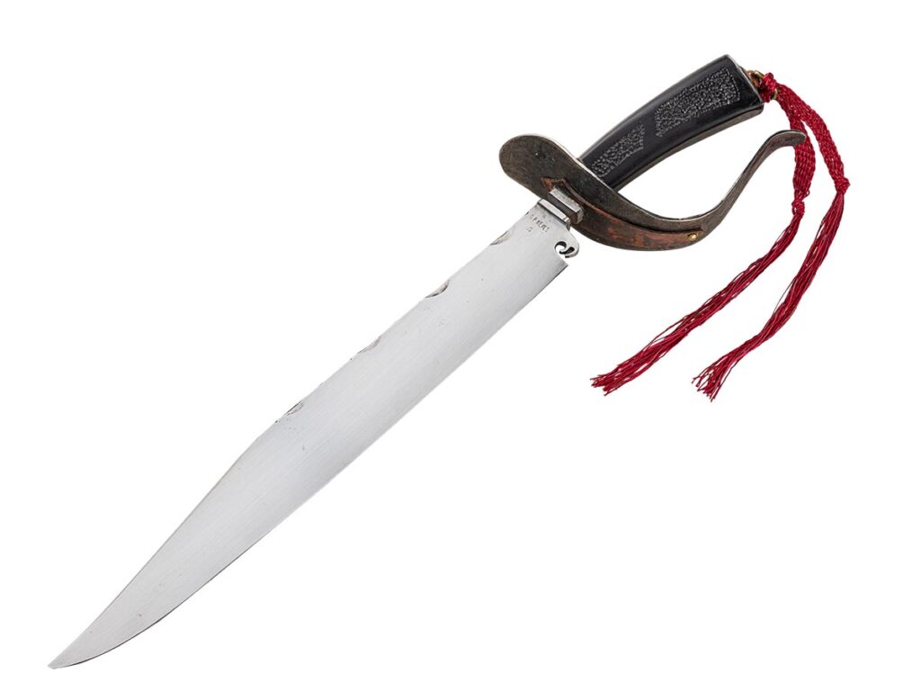 刃长: 16”刃材: 1080 碳钢开刃方式: 平磨柄: 水牛角装具: 杰夫・凯斯海盗鲍伊刀额外物品: 玛丽安·乔治手工制作的丝穗总长: 22”价格: $1,500Maker: Geoff Keyes