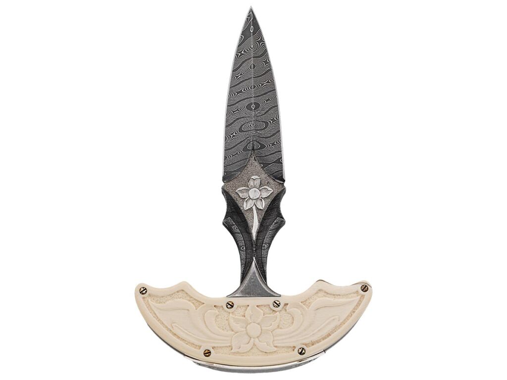 刃长: 3.25”刃材: 1084碳钢与15N20镍合金钢材制成的扭转纹大马士革钢开刃方式: Dagger手柄: 猛犸象牙带雕刻总长: 6.5”价格: $2,550Maker: Frank Edwards