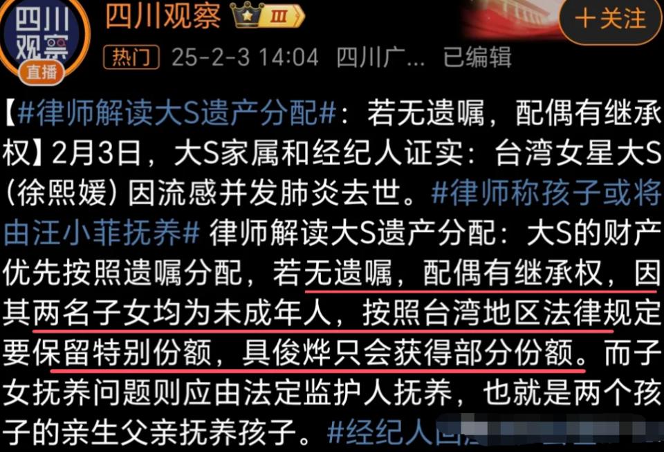 而且因为两个孩子还没成年,这笔遗产暂时会由法定监护人汪小菲代管。