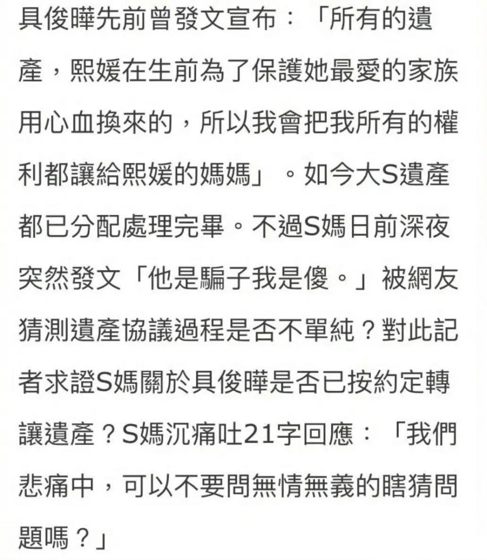 而具俊晔放弃遗产,除了对大S的深情,估计也有现实考量。
