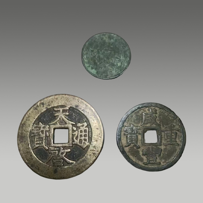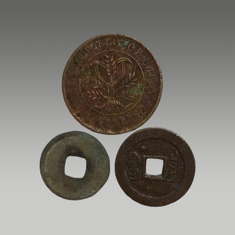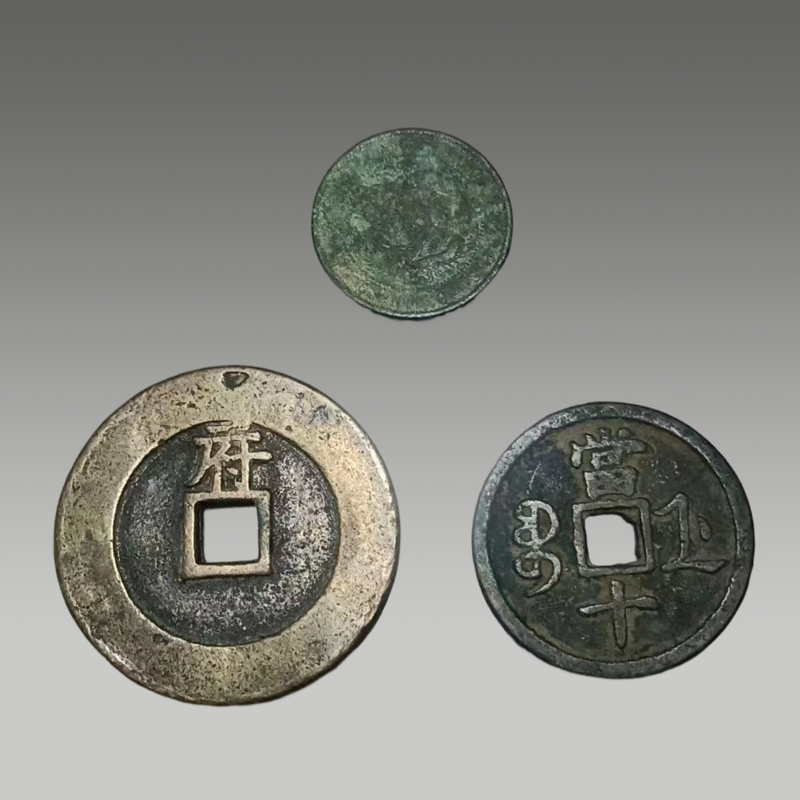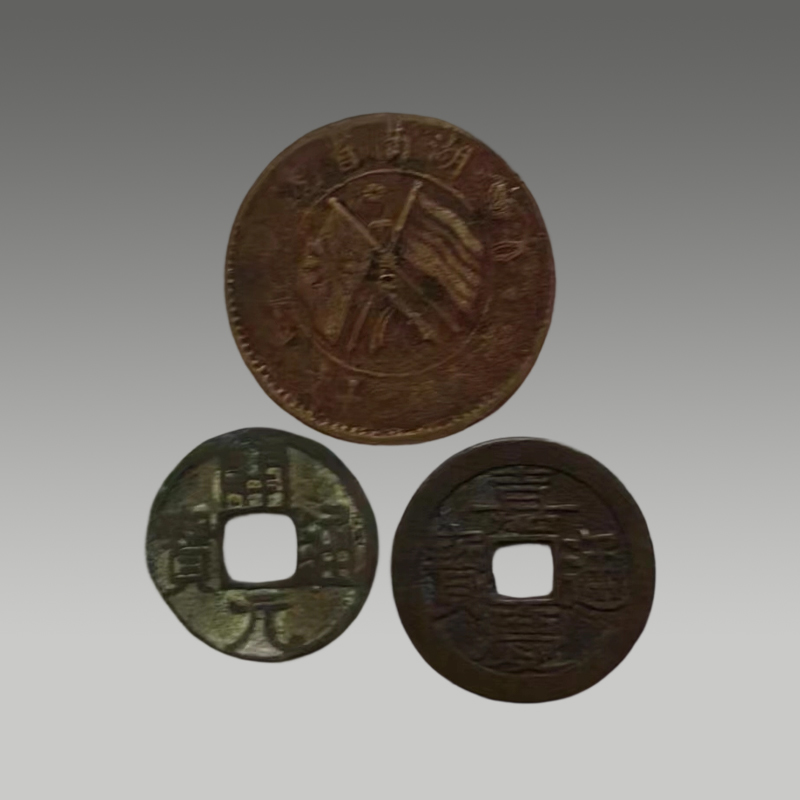这三枚钱币含一枚“重宝”大钱、一枚“通宝”钱币,还有一件铜元,品相完好包浆自然