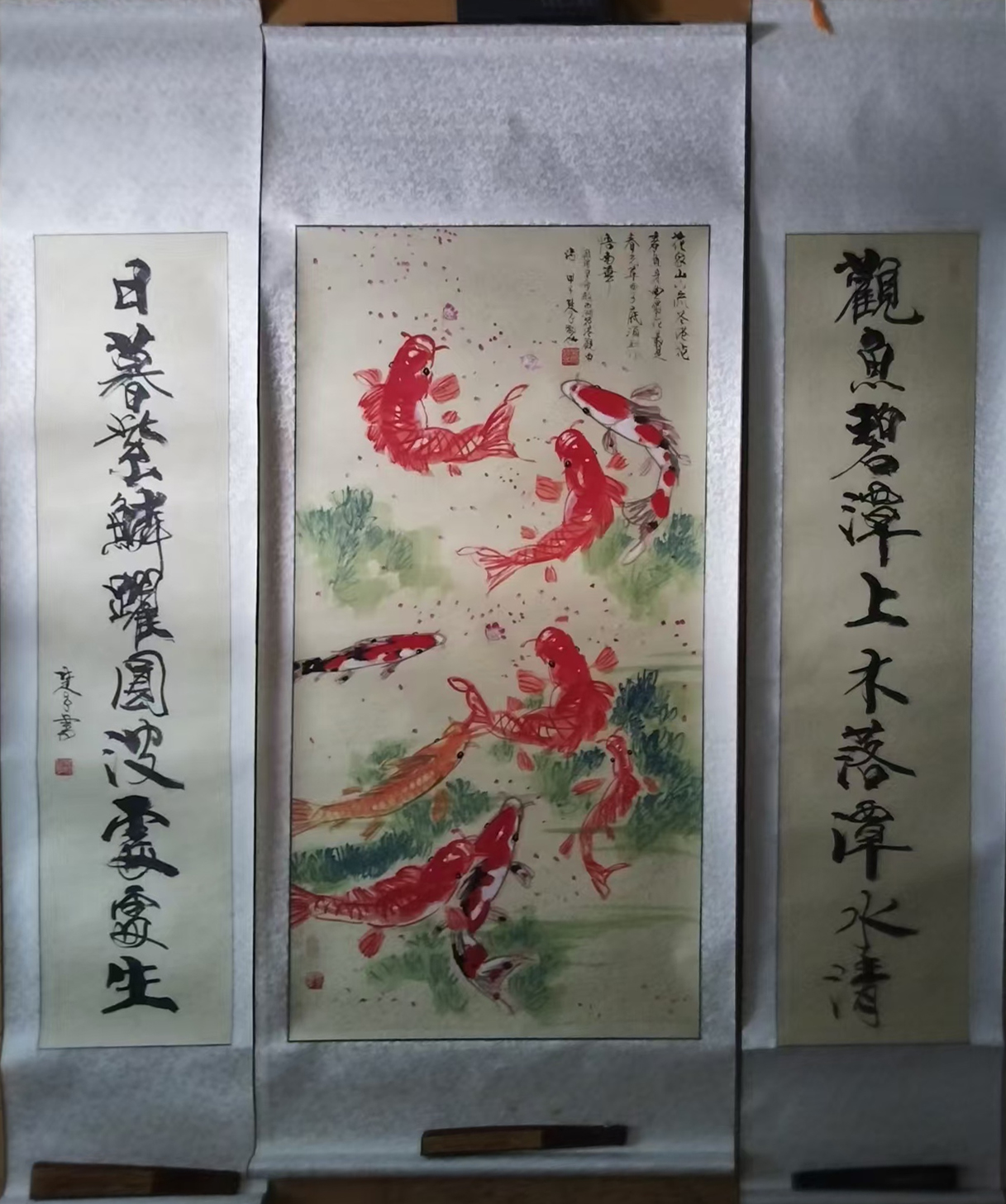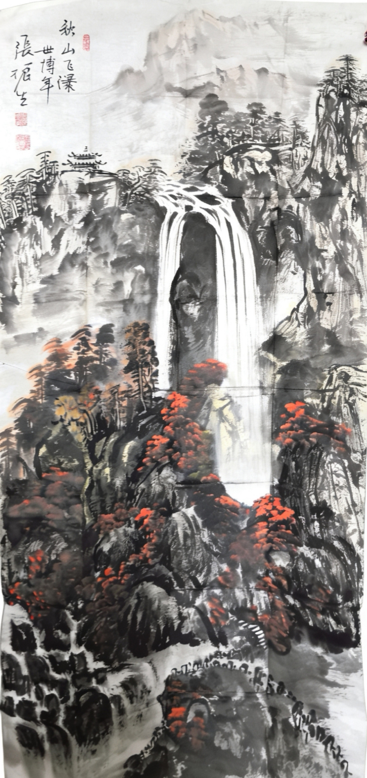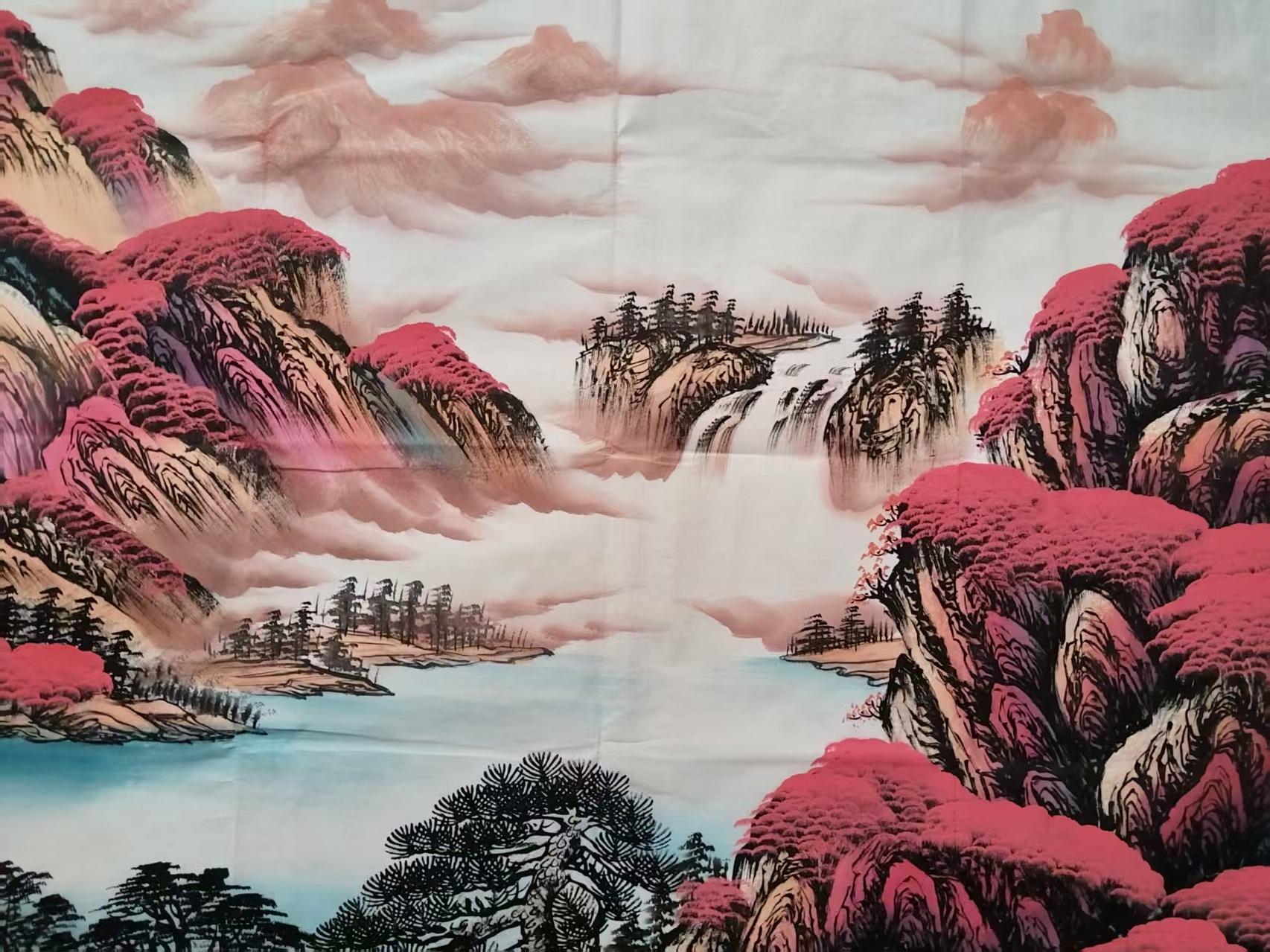 以飞瀑为视觉核心,画中兼具山水的雄浑气势与秋景的诗意氛围,寓意财源滚滚,生生不息