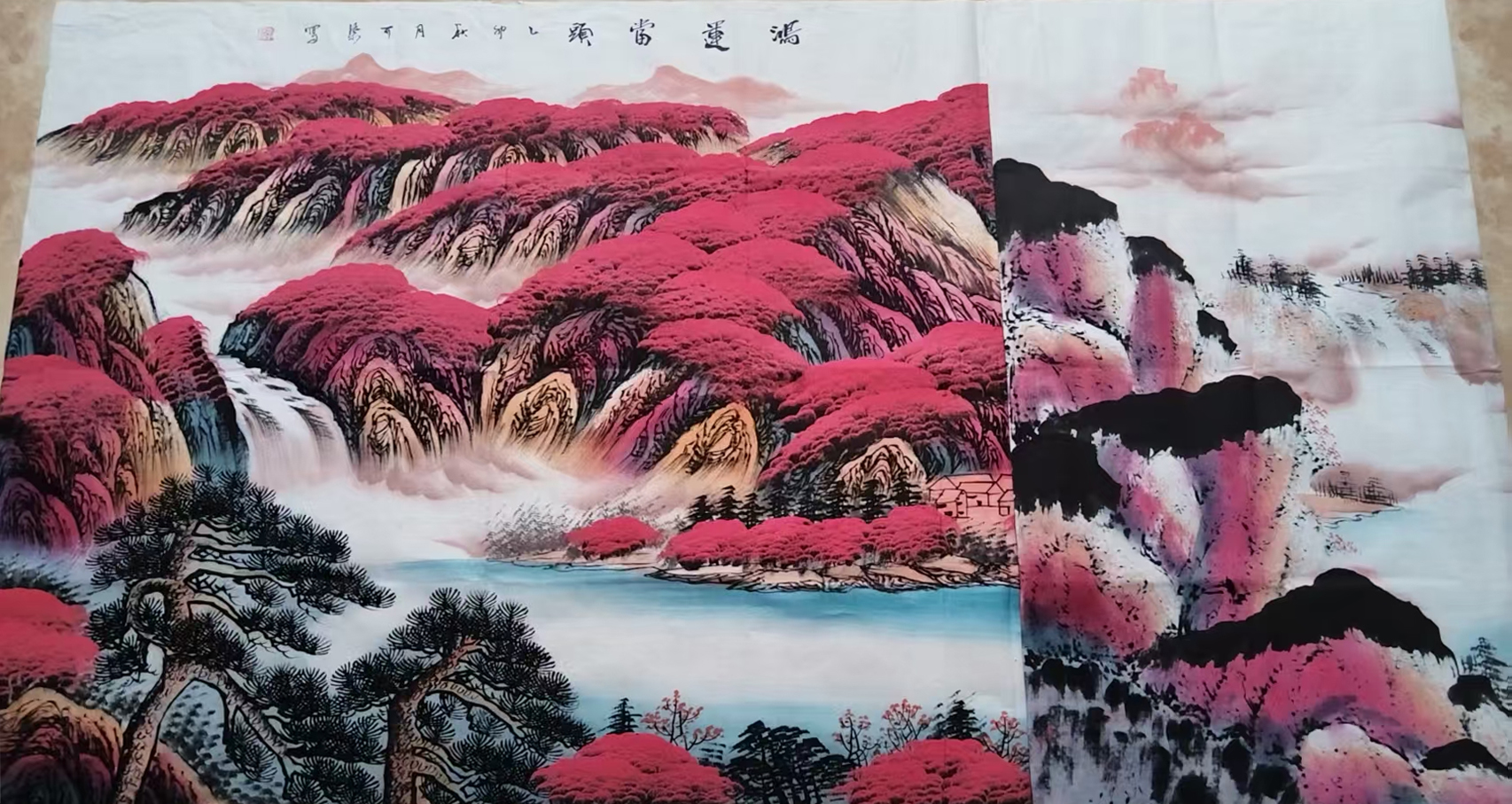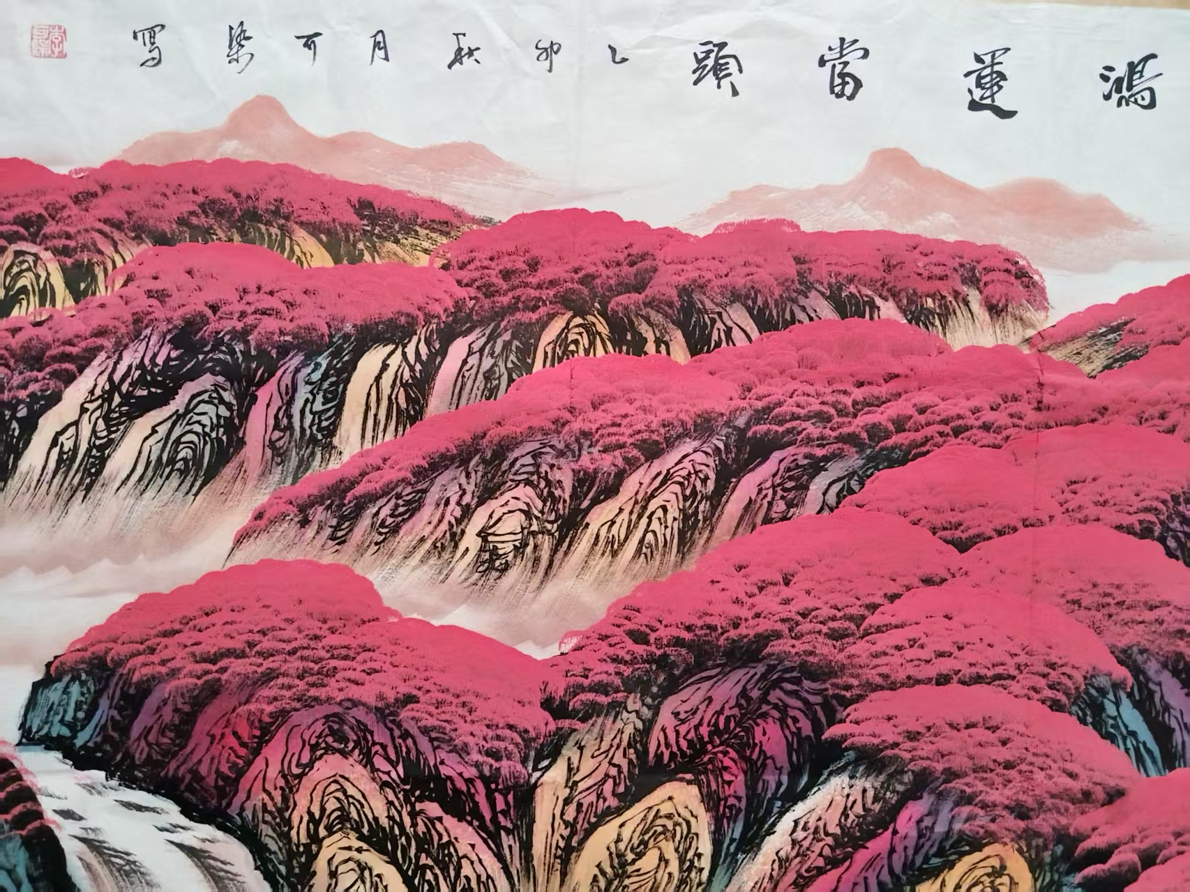 此幅作品属于作者“红色山水”的延伸题材,融合中西、革新传统的巅峰成就,具备极高的艺术史地位