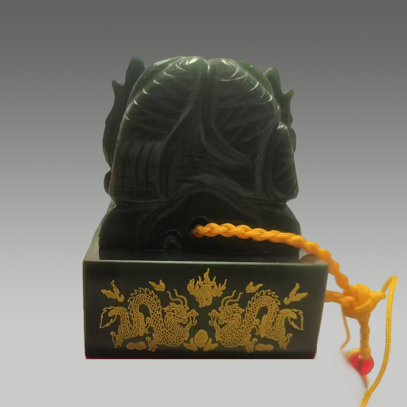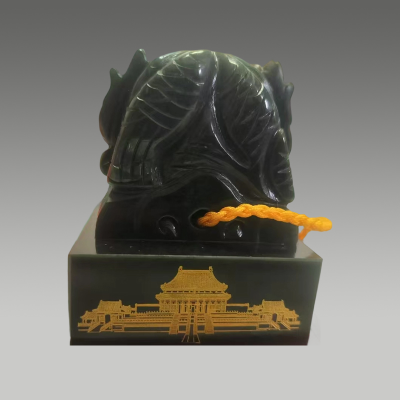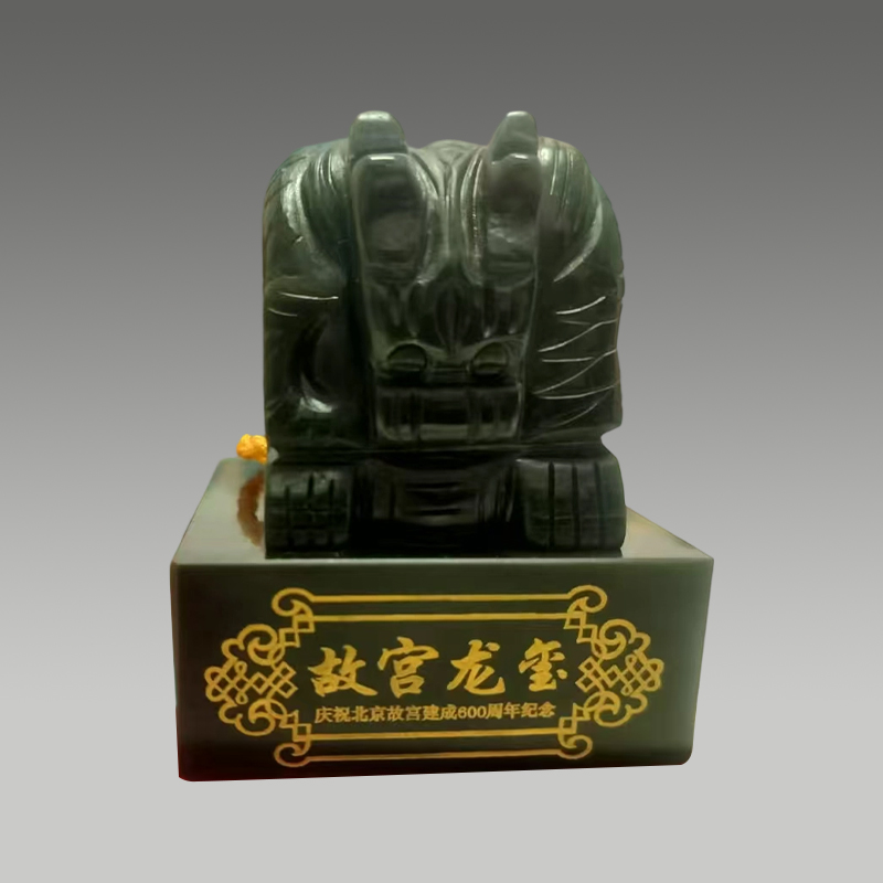 这尊宝玺甄选优质青玉精心雕琢而成。玺身双龙盘绕,威严庄重,兼具纪念意义,极具收藏价值