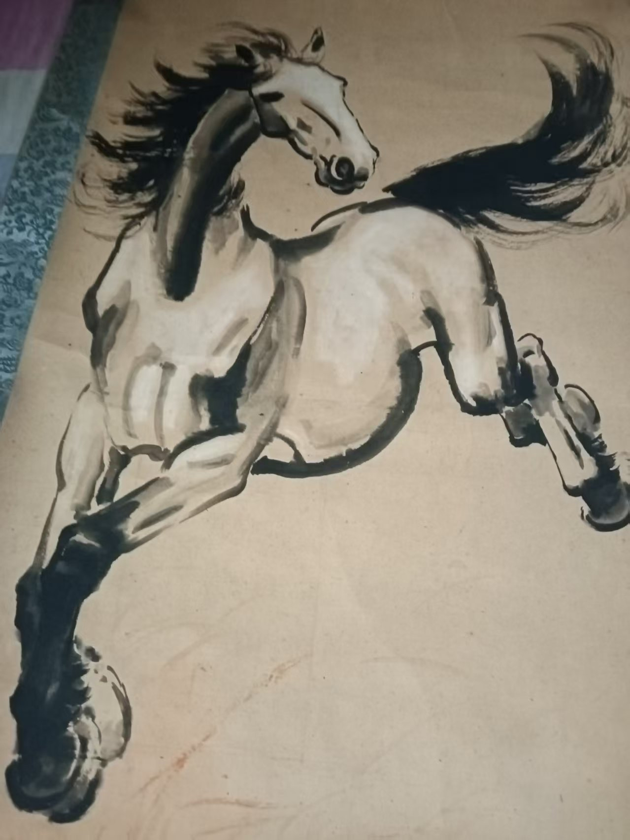 奔马图是作者标志性的作品,马匹肌肉结构比例协调,笔墨层次整齐,极具生动气运,开创了我国国画的新规范