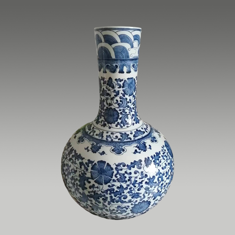 此器为经典天球瓶形制,圆腹饱满、长颈挺拔,线条流畅大气,尽显中式美学的端庄与雅致