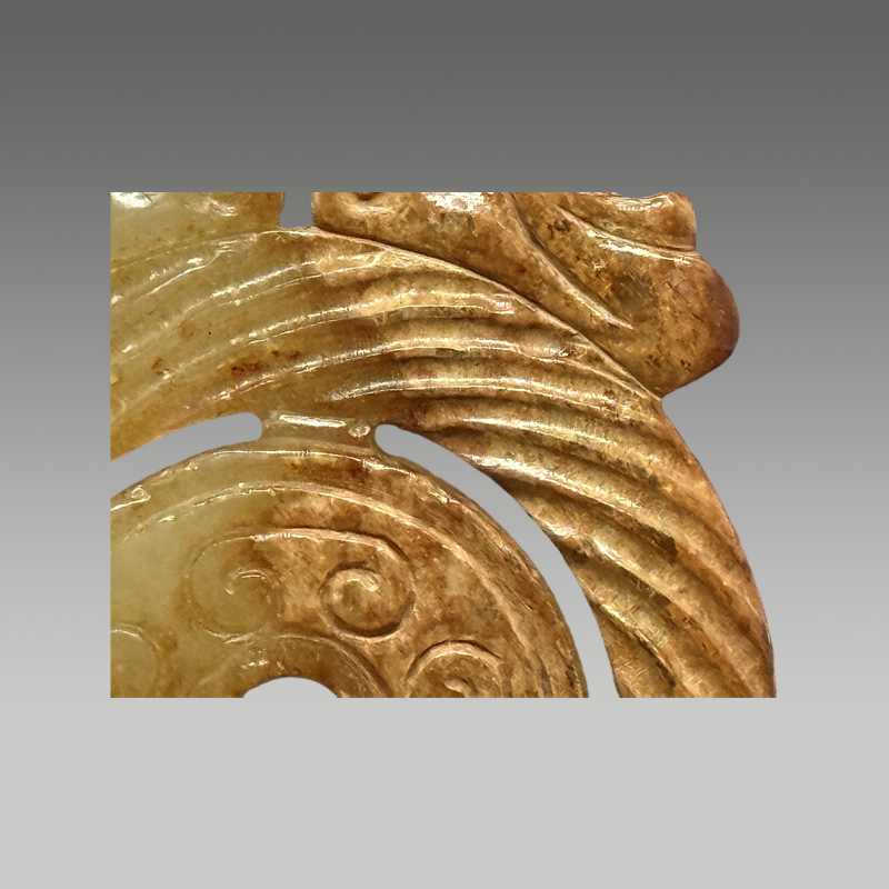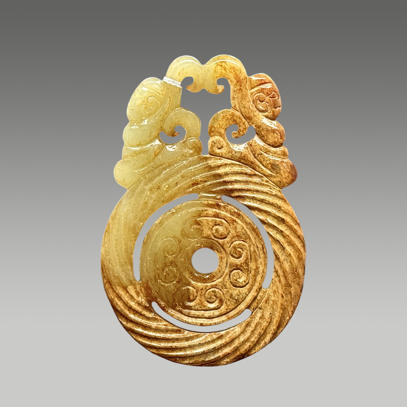 绞丝纹岀廓壁,中心的小圆璧与外层环体相扣,工艺精巧,体现了当时高超的镂空与碾磨技术,市场价值极大