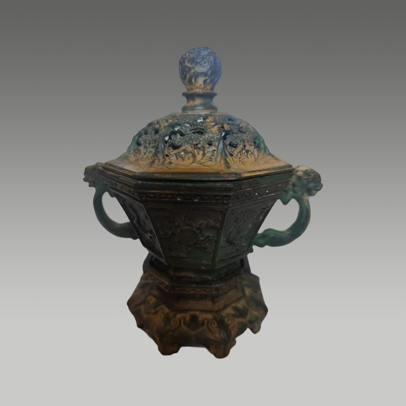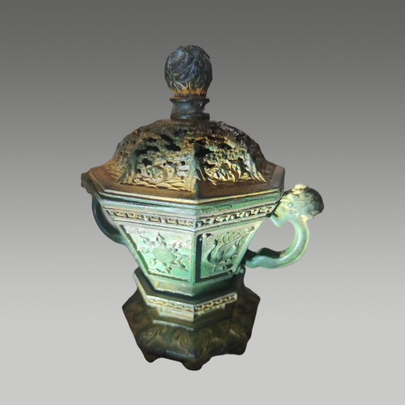 六方造型,带镂空盖、兽耳、底座,盖顶有瑞兽钮,器身有纹饰,兽耳杯包浆温润、层次丰富纹饰线条流畅